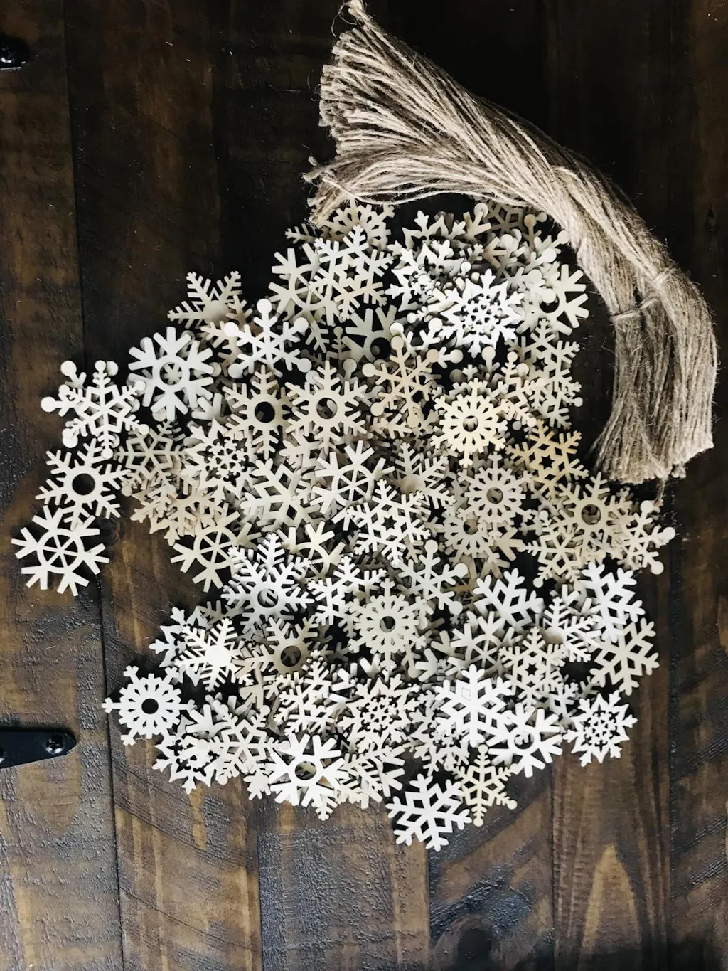 - 🍀-- ✔Incluye: recibirás 150 adornos de copos de nieve de madera, 150 cuerdas de cordel en un paquete, puedes utilizar cuerda de cordel para asegurarlos, luego colgar en el árbol de Navidad u otras decoraciones que desees, fácil de operar.