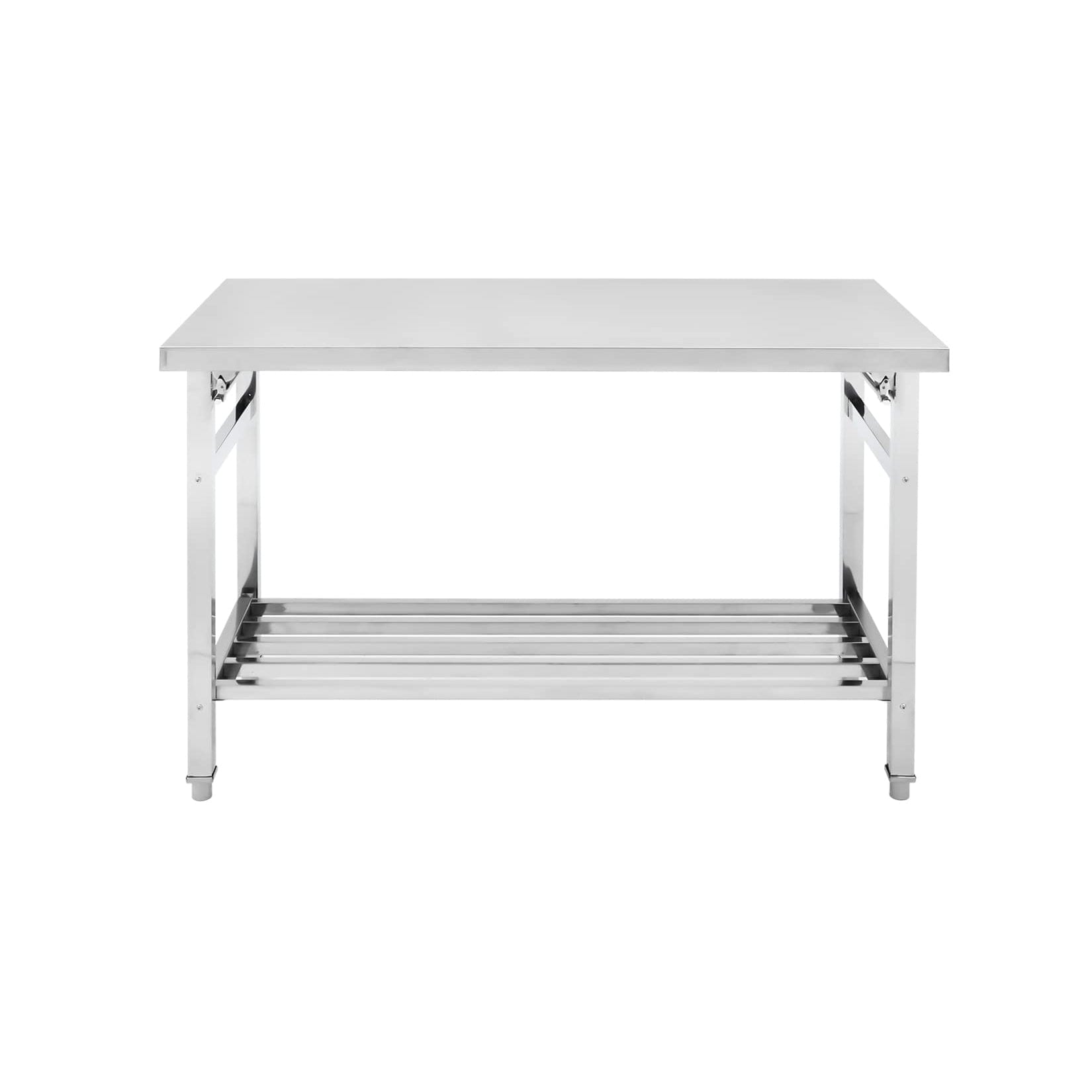 Bought this 48 × 24 stainless steel folding prep table for weekend pop-ups. It sets up in under five minutes, feels rock-steady under a 50-pound mixer, and the adjustable undershelf swallows cambros. After service, I fold it and slide it behind the fridge—no rust, no wobble, NSF-clean surface.