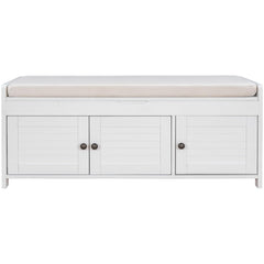Garvee Upholstered Storage Ottoman Bench With 3 Shutter-shaped Doors Cabinet, Shoe Bench With Hidden Storage Space, Removable Seat Cushion, 43.5X16X18 inch, White