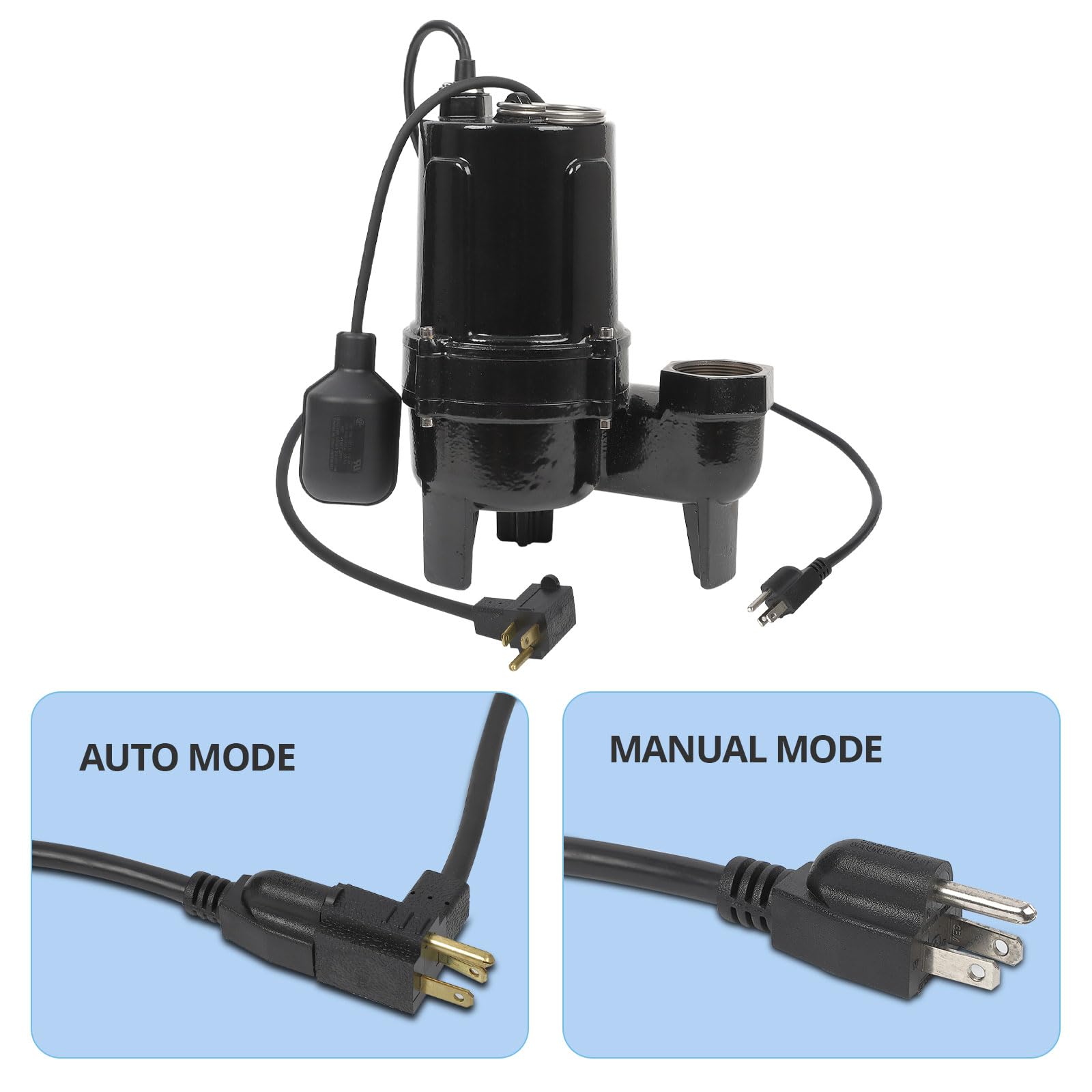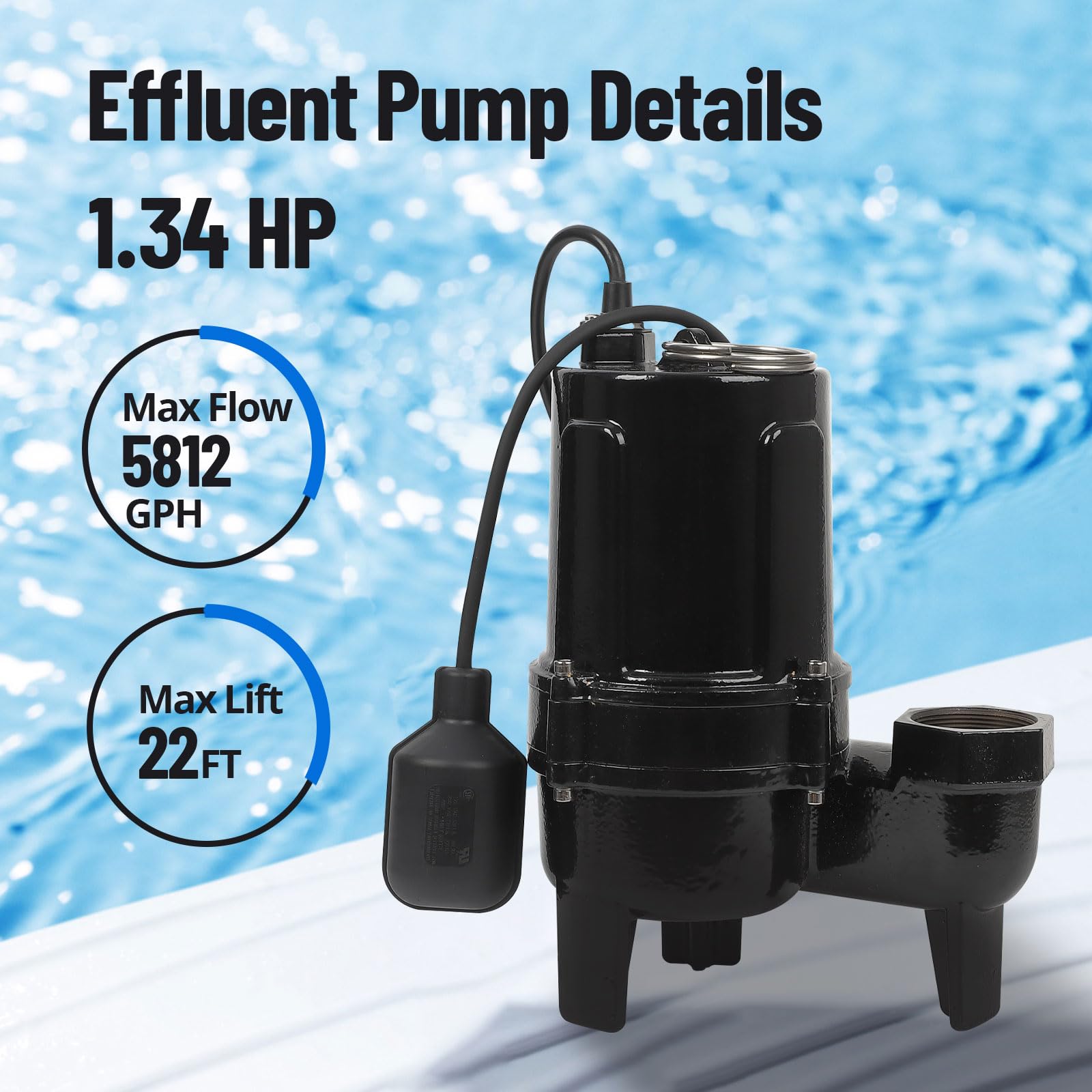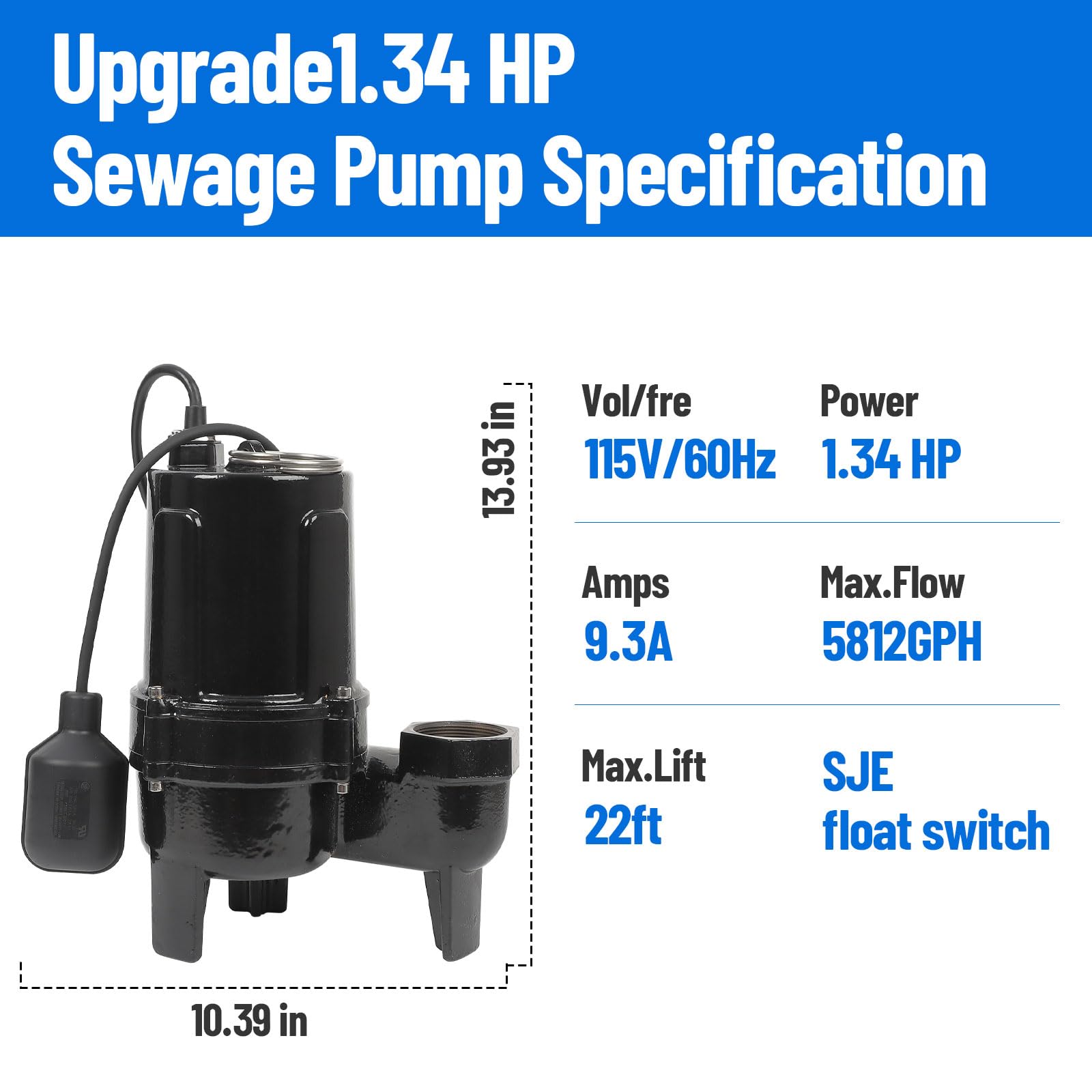 Garvee 1.34HP Submersible Sewage Effluent Pump, 5812GPH Cast Iron Sump Pump with Vertical Float Switch & 10FT Power Cord, Sewage Grinder Pump for Sump Basin, Basements, Residential Sewage, Septic Tank