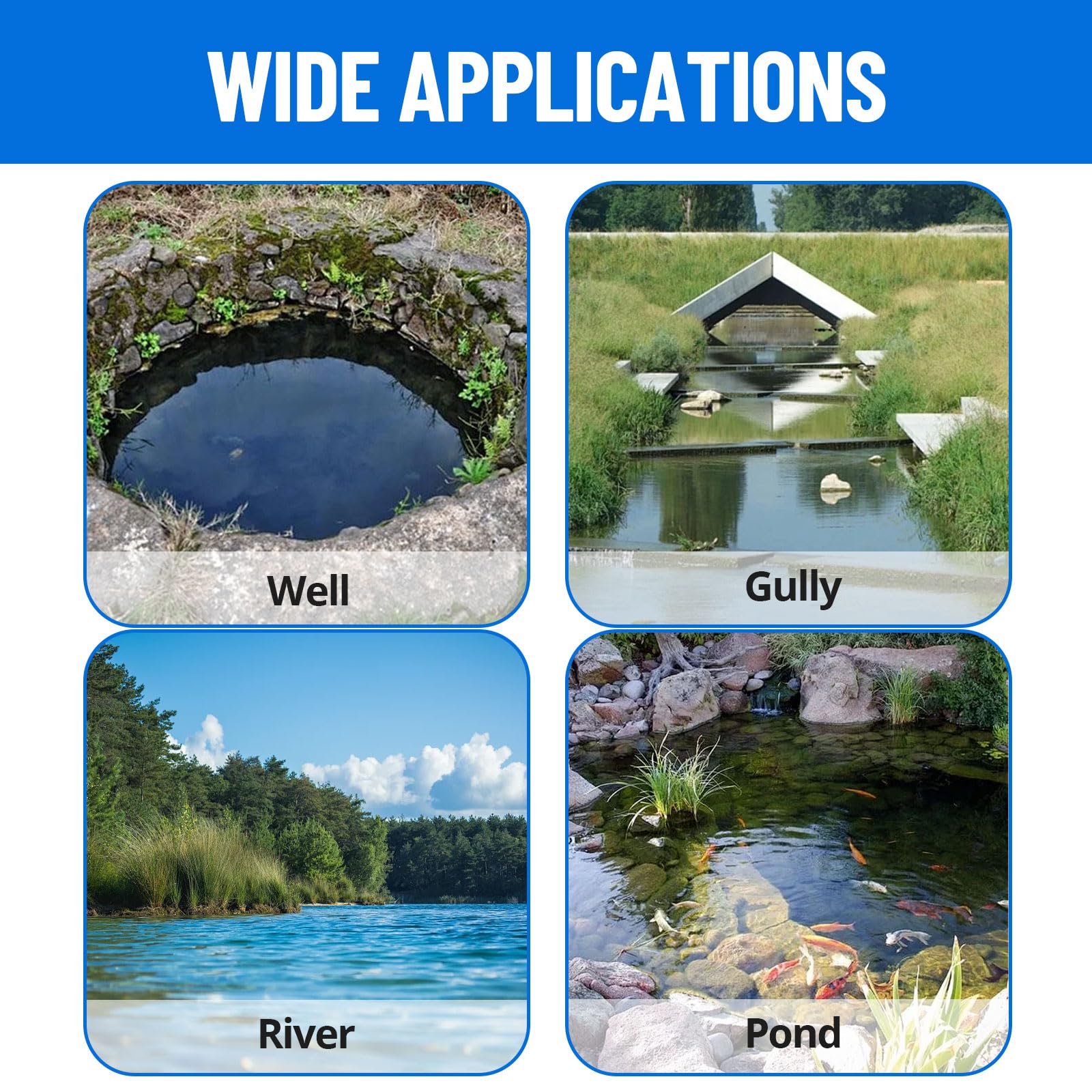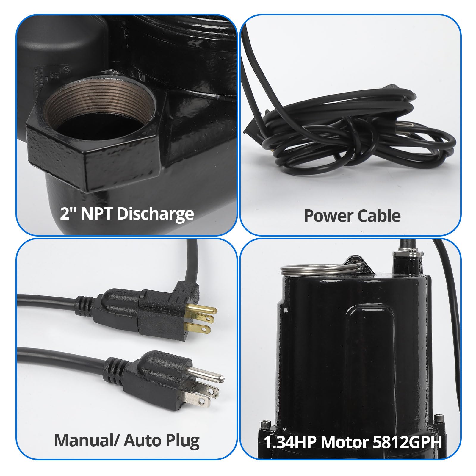 1.34HP Power motor discharges up to 5812 Gallon Per Hour22Ft Maximum liftIPX8 Waterproof thermoplastic Plastic2” NPT dischargeAutomatic/Manual On/off