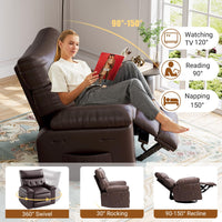 - Swivel Rocker Recliner: The rocking recliner includes a 360° swivel feature for easy rotation and a 30° rocking function for soothing motion. Recline up to 150° using the side handle and extend the footrest for maximum relaxation.