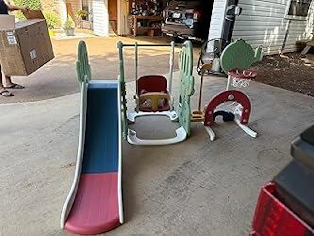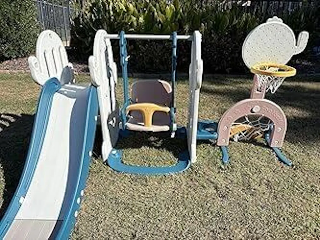 - 7-in-1 design including slide, swing, basketball hoop, and more