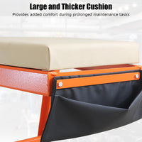 Padded high-density foam deck reduces pressure points during extended work sessions. Integrated tool bag keeps essential tools organized and within easy reach.