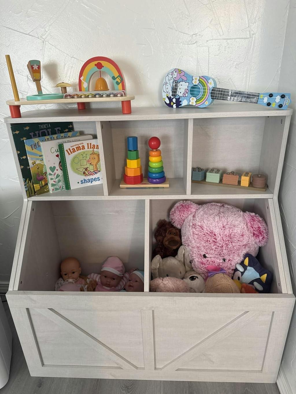 - 【Multifunctional Storage Organization】This kids toy storage organizer combines bookshelf and toy storage cabinet design. 3 open cube shelves can display children's favorite books and toys. 2 bottom storage boxes are spacious for building blocks, splush, dolls, balls, toy trucks, toy cars, etc. Besides, the spacious top is ideal for placing picture frames, plants, clock and lamp etc.