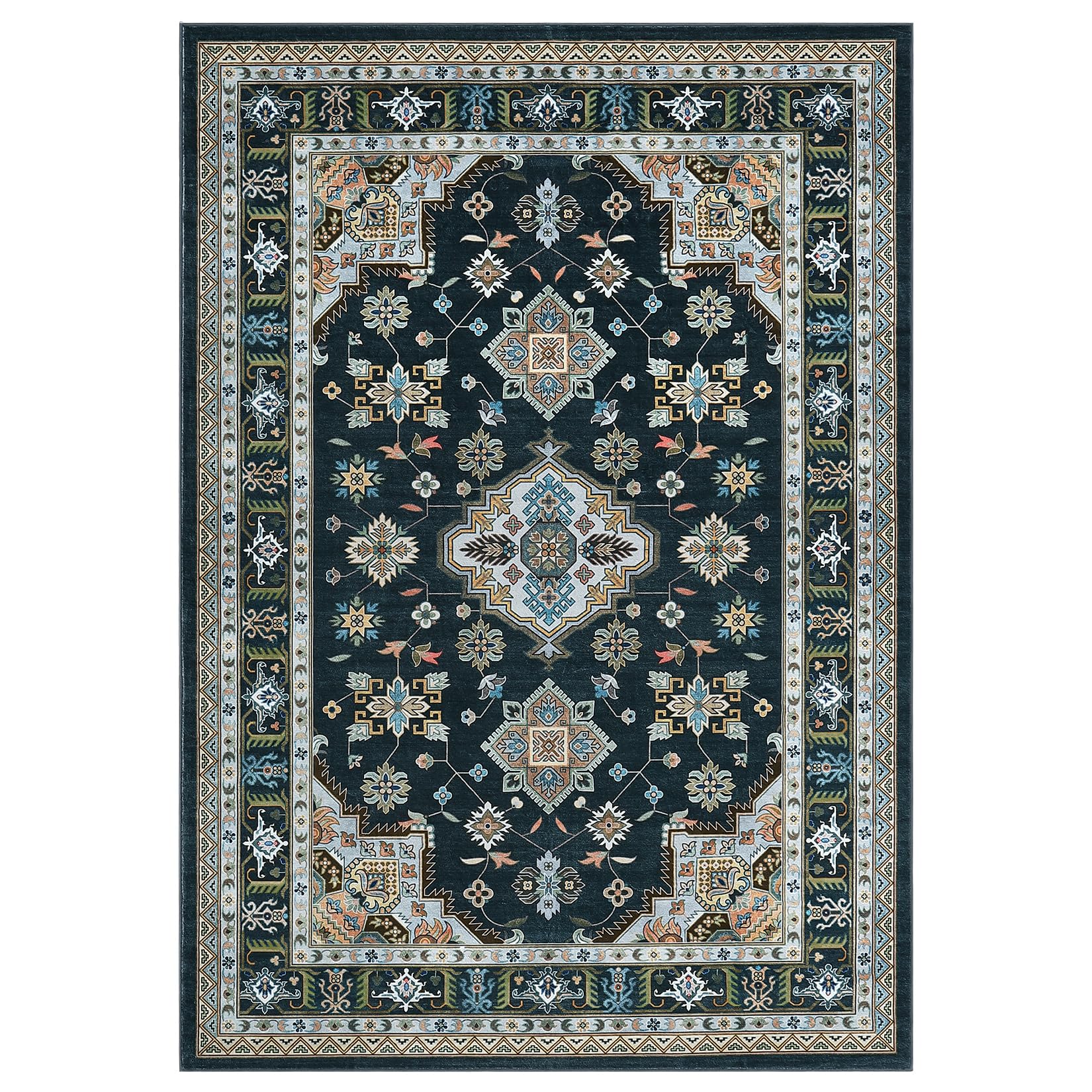 Garvee Traditional Medallion Border Area Rug, 9x12 Washable Vintage Indoor Rug, Ultra-Thin Non-Slip Print Floor Carpet for Living Room Bedroom Kitchen Dining Room, Black