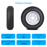 - 4.80-8 Trailer Tire : With a rim size of 8" diameter and a bolt configuration of 5 lug on 4.5", these tires are engineered for compatibility and ease of installation on various trailer types.