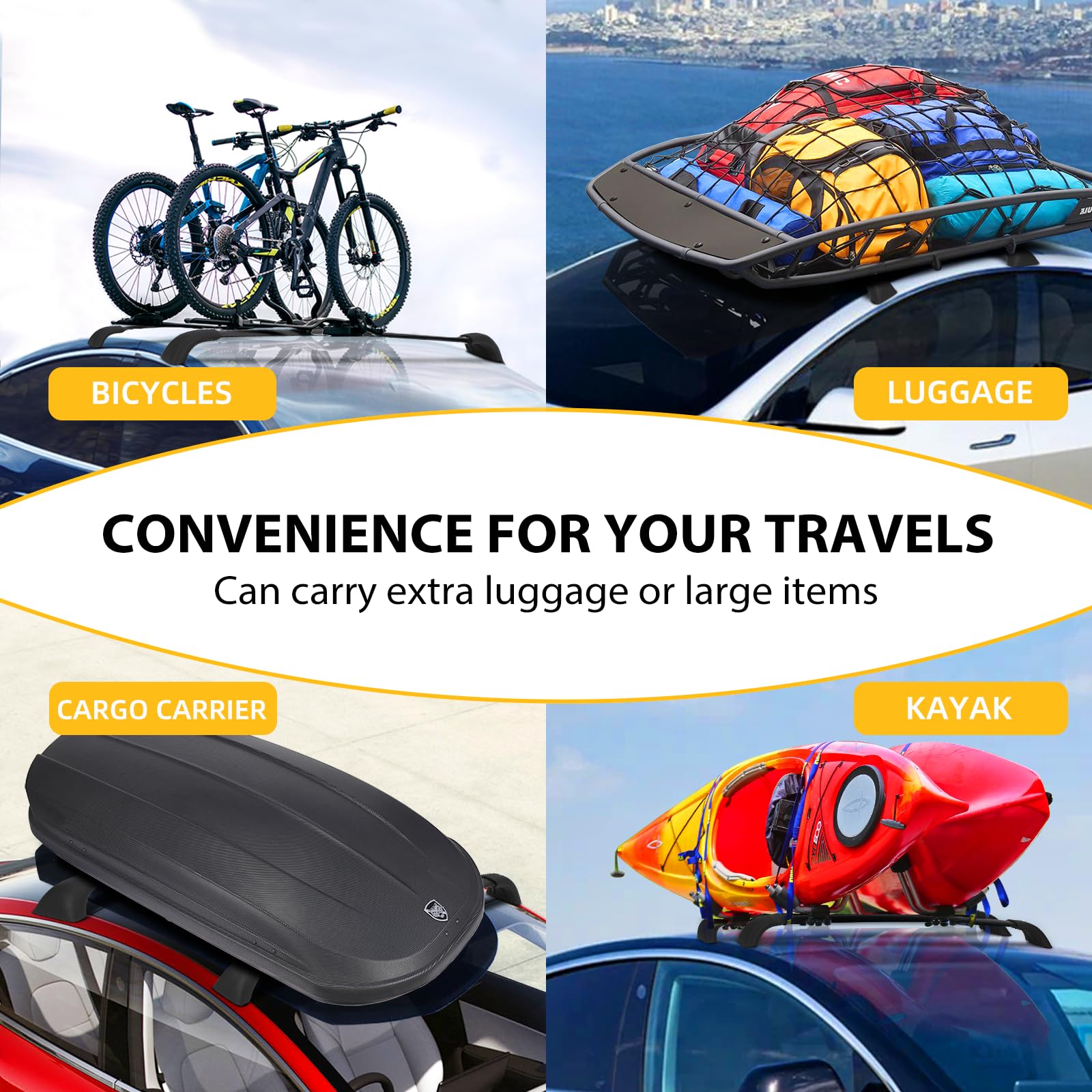 - 【Multi-Functional Cross Bar】This cross bar is suitable for cargo carriers, bike racks, skis, roof boxes, roof bags, kayak racks, canoe racks.