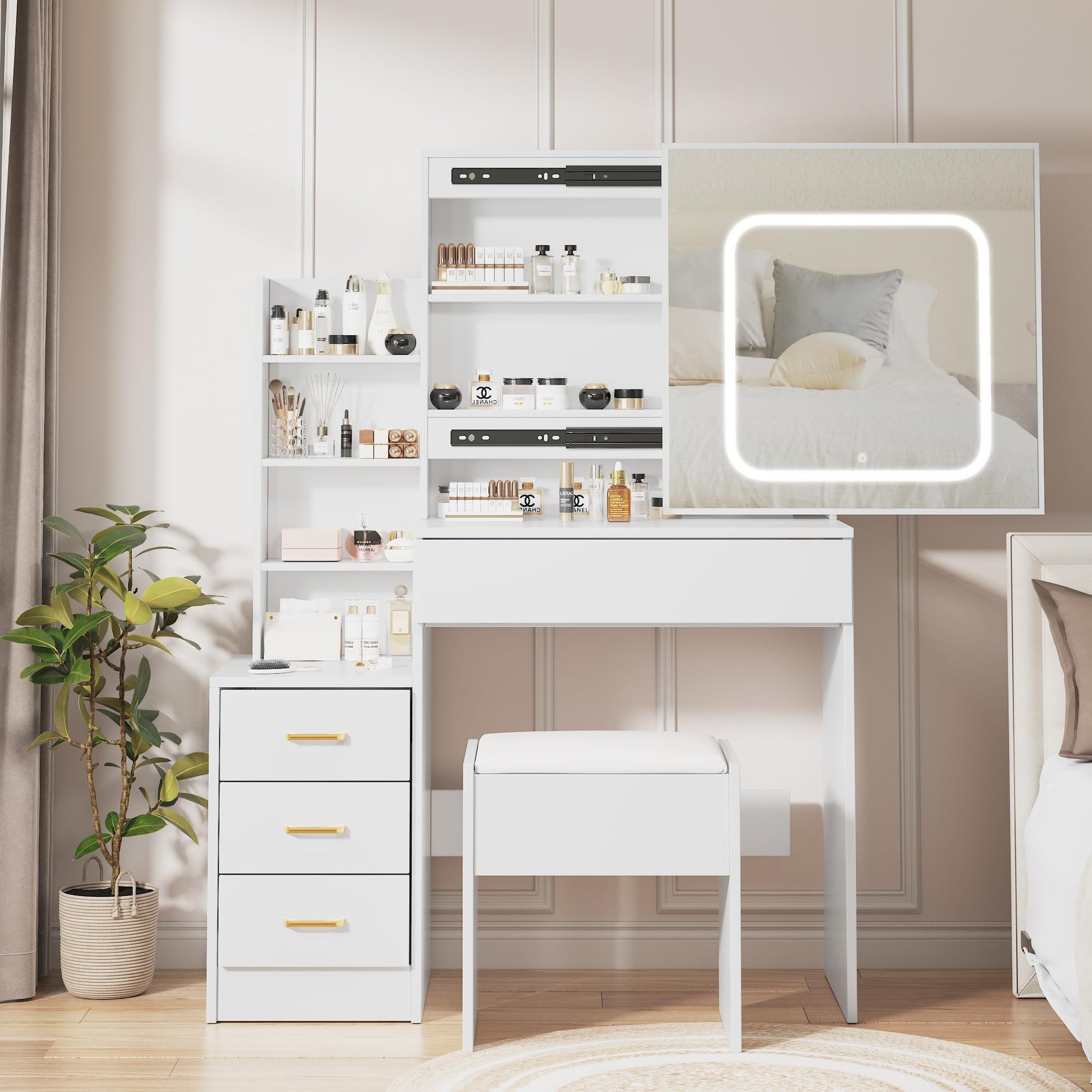 Garvee Vanity Desk with LED Mirror, 3 Mode Lighting, Charging Station, 4 Drawers, Shelves, Cushioned Stool, White, Bedroom