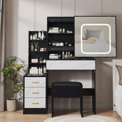 With its sleek white finish, LED-lit mirror, and cushioned stool, this vanity desk combines style with comfort. The built-in charging station and ample storage make it a practical addition to any bedroom.