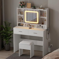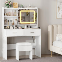 Garvee Vanity Desk with Sliding Mirror, Makeup Desk and Stool with Lights in 3 Colors, Girls Vanity Table with Charging Station, 2 Drawers & Storage Shelves for Bedroom,White