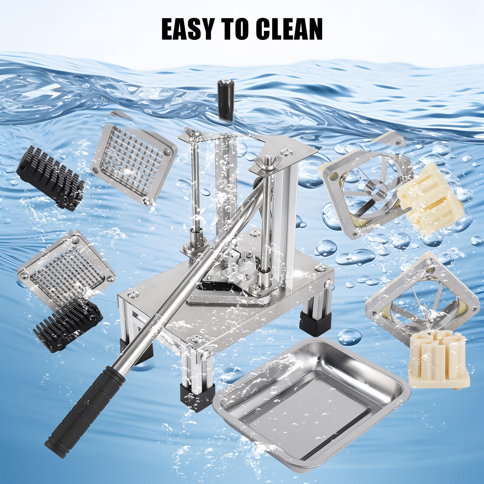 The sturdy commercial chopper is equipped with 4 sharp blades 1/4”, 3/8”, 6-wedge slicer and 6-wedge corer.