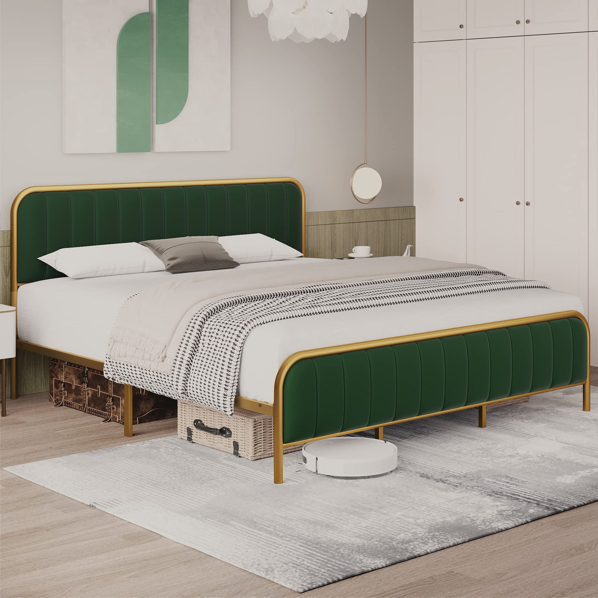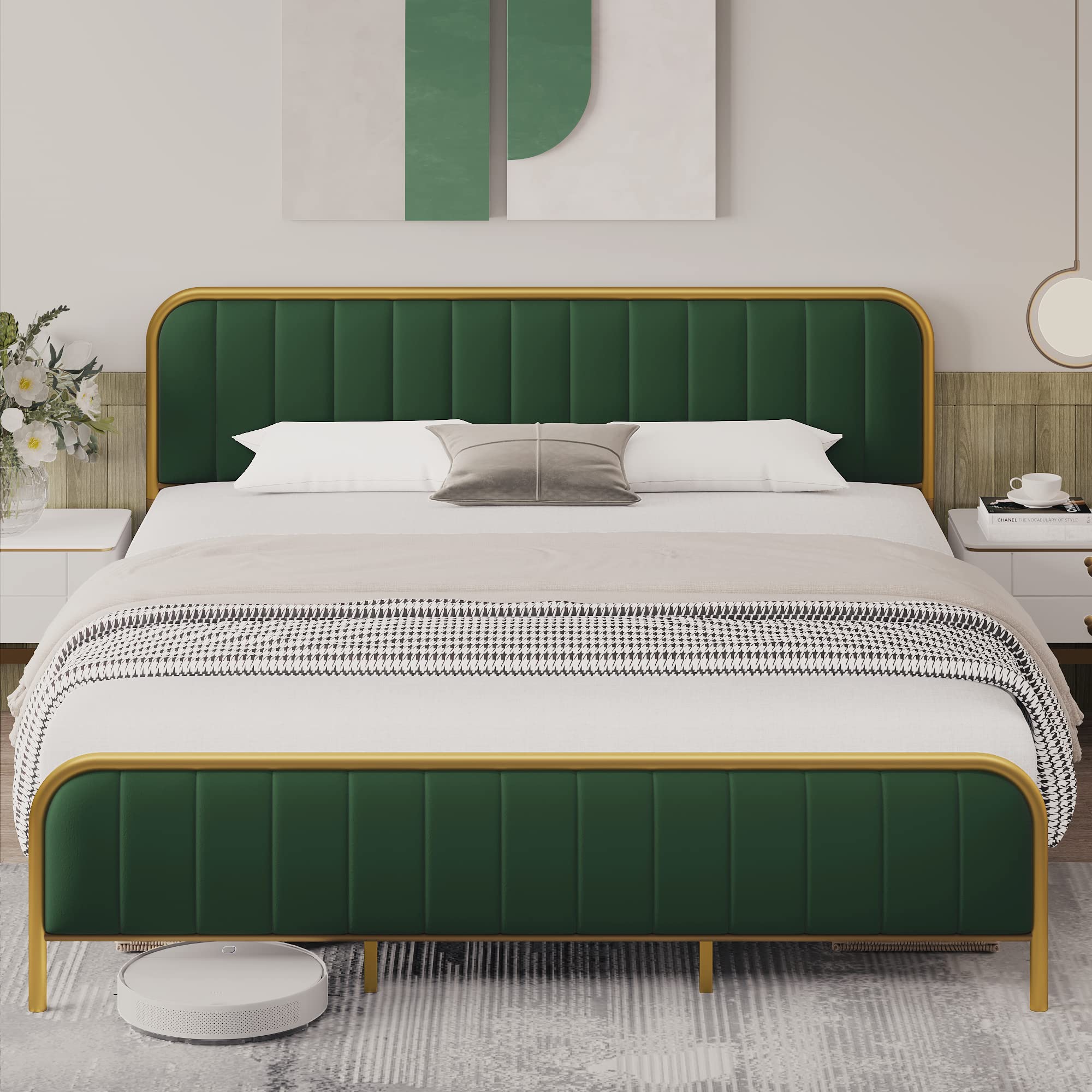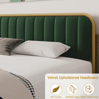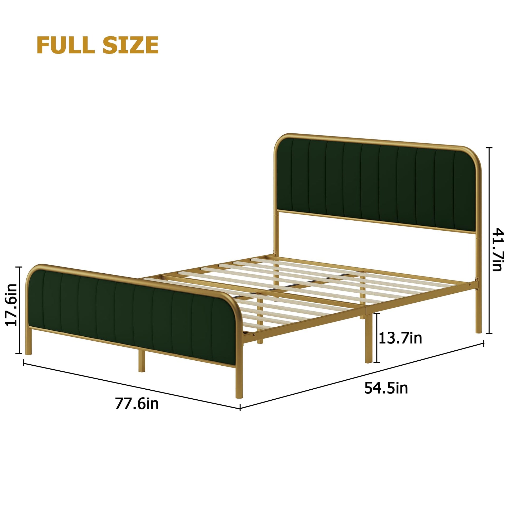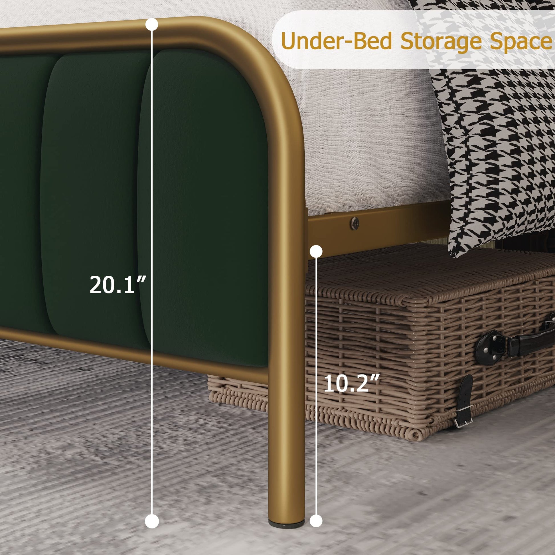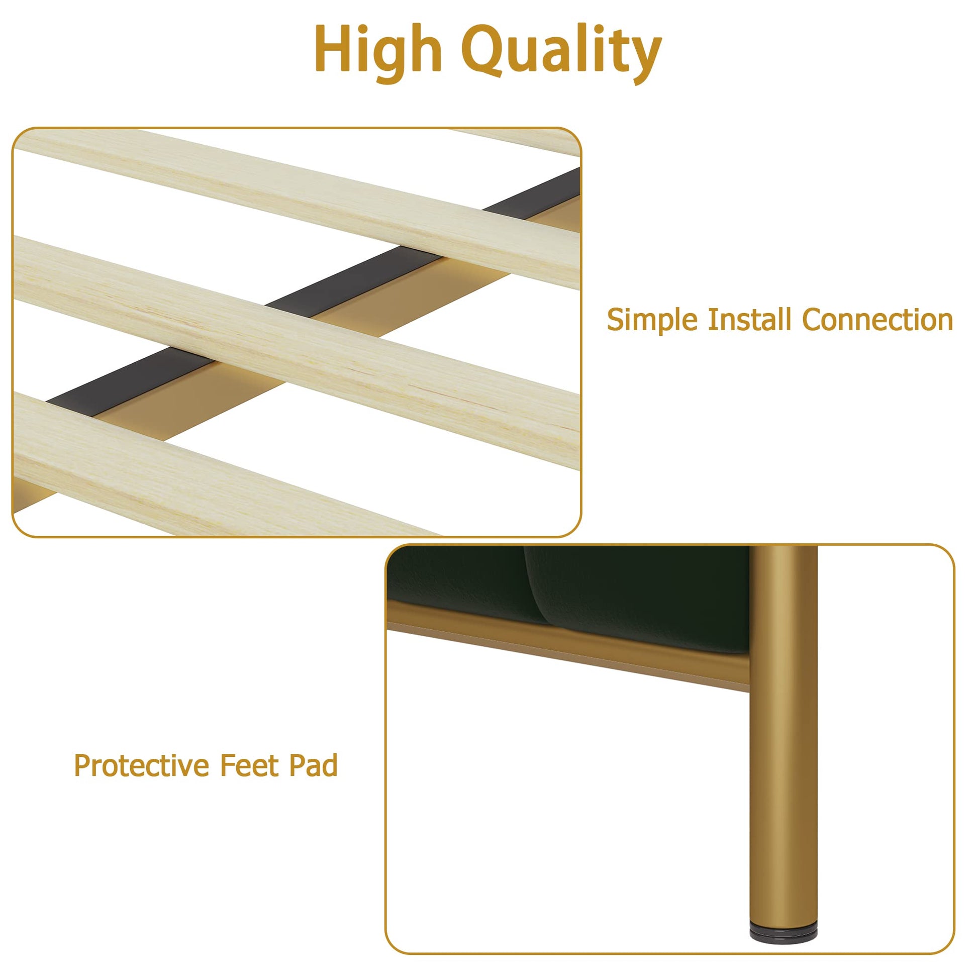 Garvee Full Size Velvet Upholstered Bed Frame with Headboard, Gold Frame, Wooden Slats, No Box Spring Needed, Green and Gold, Modern Design, Underneath Storage, Easy Assembly