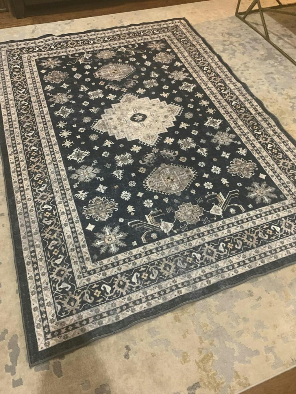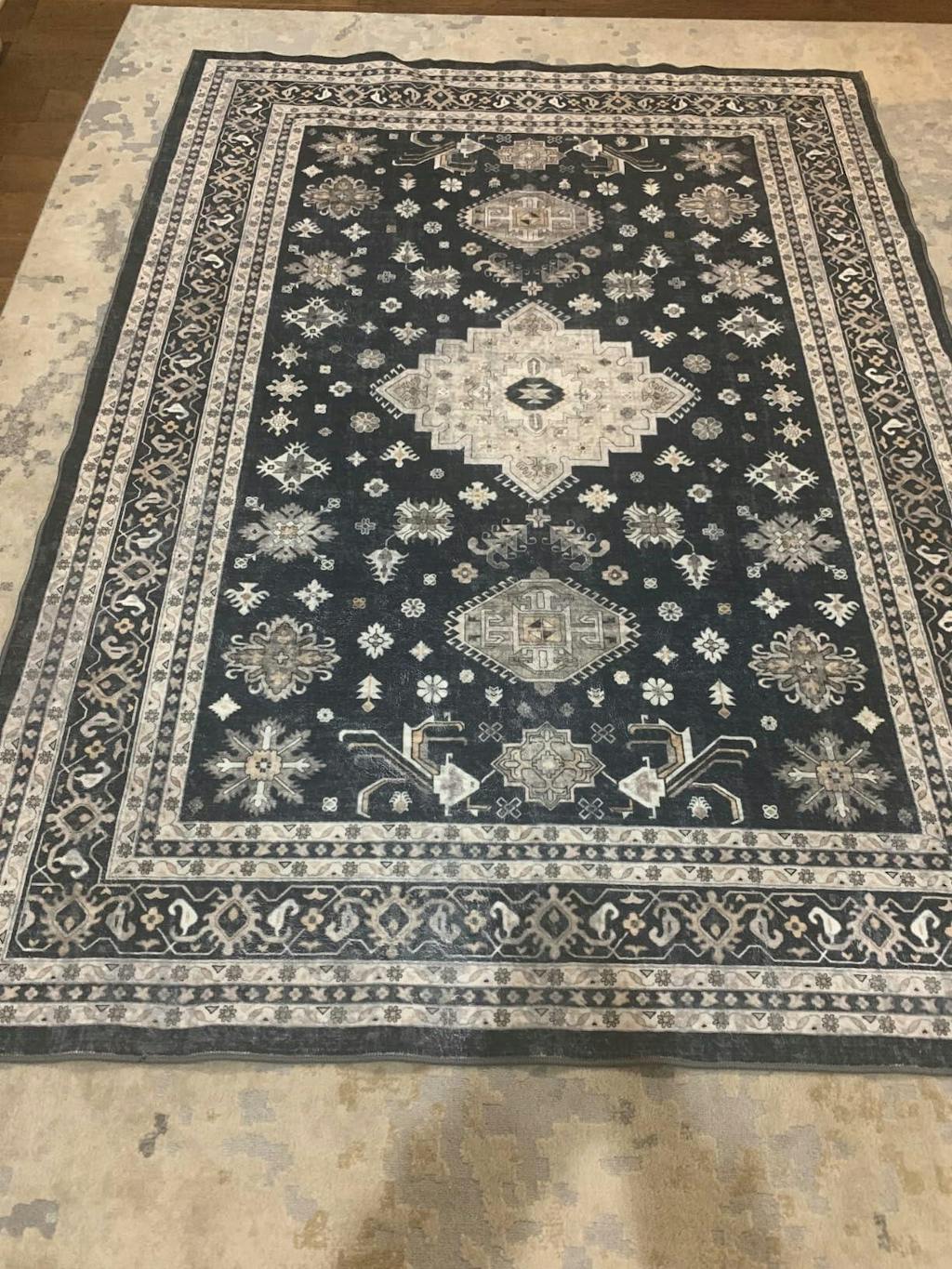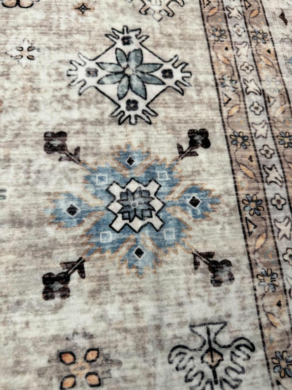 This is a very beautiful rug that reminds me of the traditional Persian or Turkish rugs you often see in homes and businesses- but this one has a more modern boho feel to it. I received the rug folded and it had a few creases in it- but since it is a washable rug I put it in the machine in the regular wash cycle and then took it out and laid it flat to dry. By morning it was completely dry and all the creases were gone.I should note that this rug is not a thick rug if that’s what you are expecting- it is thin enough that it can be wadded or folded up and put into a standard size washing machine. For the larger sizes of this rug you may have to use a commercial washer at a laundromat, but I had no trouble washing the 5’7 rug in my machine at home.The thing I didn’t expect about this rug is how soft it is! It feels like velvet or a similar fabric underneath your feet. This rug is well worth the money and is perfect for someone who needs a low maintenance rug that can be washed in case of spills or accidents. It is perfect for people with small children or pets that track in mud/ dirt. Beautiful traditional style rug with a modern boho twist. 5 stars!