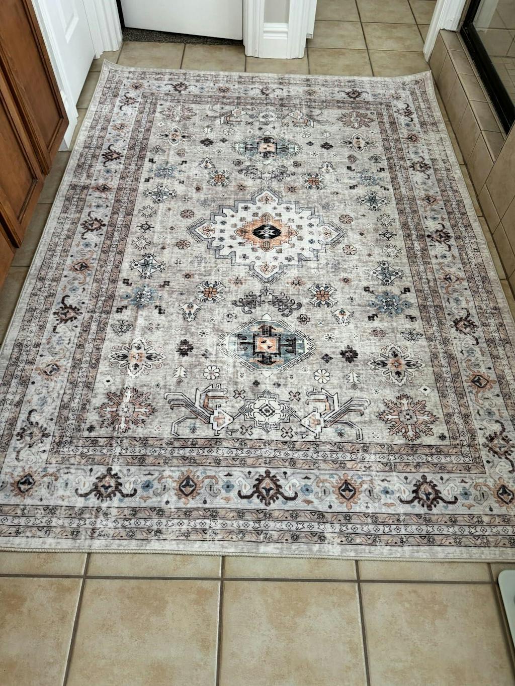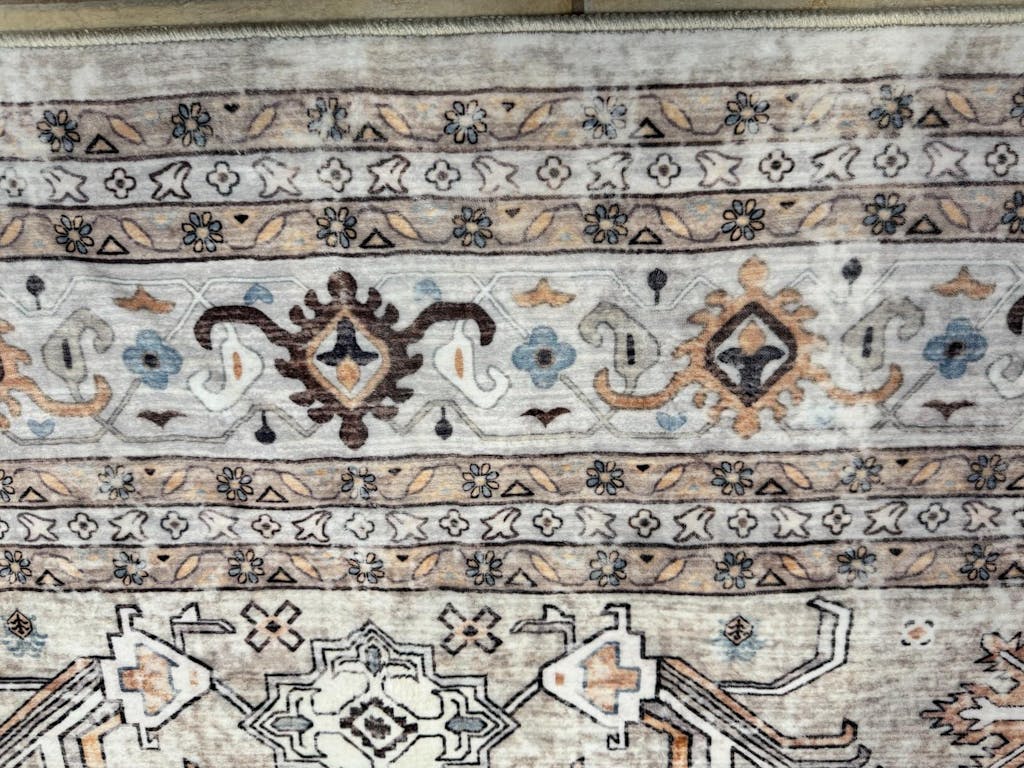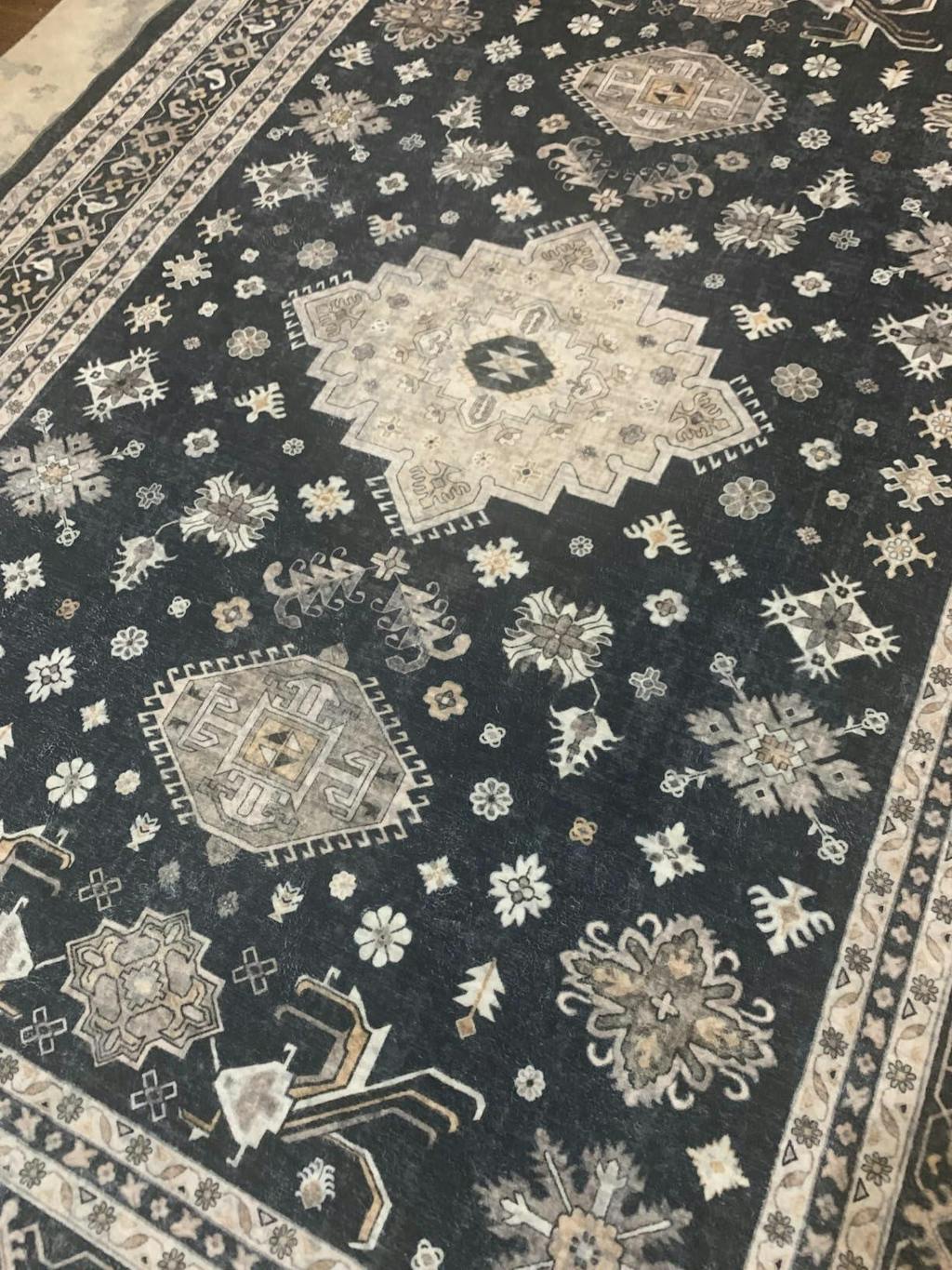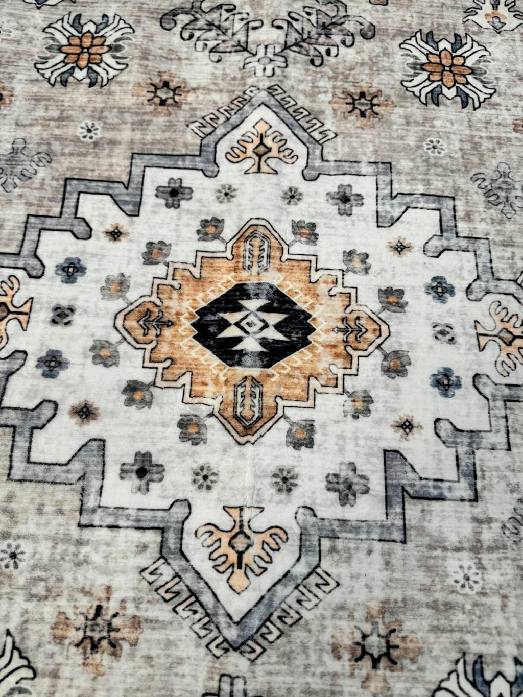 This is a very beautiful rug that reminds me of the traditional Persian or Turkish rugs you often see in homes and businesses- but this one has a more modern boho feel to it. I received the rug folded and it had a few creases in it- but since it is a washable rug I put it in the machine in the regular wash cycle and then took it out and laid it flat to dry. By morning it was completely dry and all the creases were gone.I should note that this rug is not a thick rug if that’s what you are expecting- it is thin enough that it can be wadded or folded up and put into a standard size washing machine. For the larger sizes of this rug you may have to use a commercial washer at a laundromat, but I had no trouble washing the 5’7 rug in my machine at home.The thing I didn’t expect about this rug is how soft it is! It feels like velvet or a similar fabric underneath your feet. This rug is well worth the money and is perfect for someone who needs a low maintenance rug that can be washed in case of spills or accidents. It is perfect for people with small children or pets that track in mud/ dirt. Beautiful traditional style rug with a modern boho twist. 5 stars!