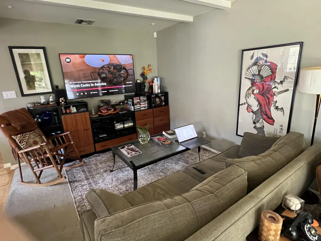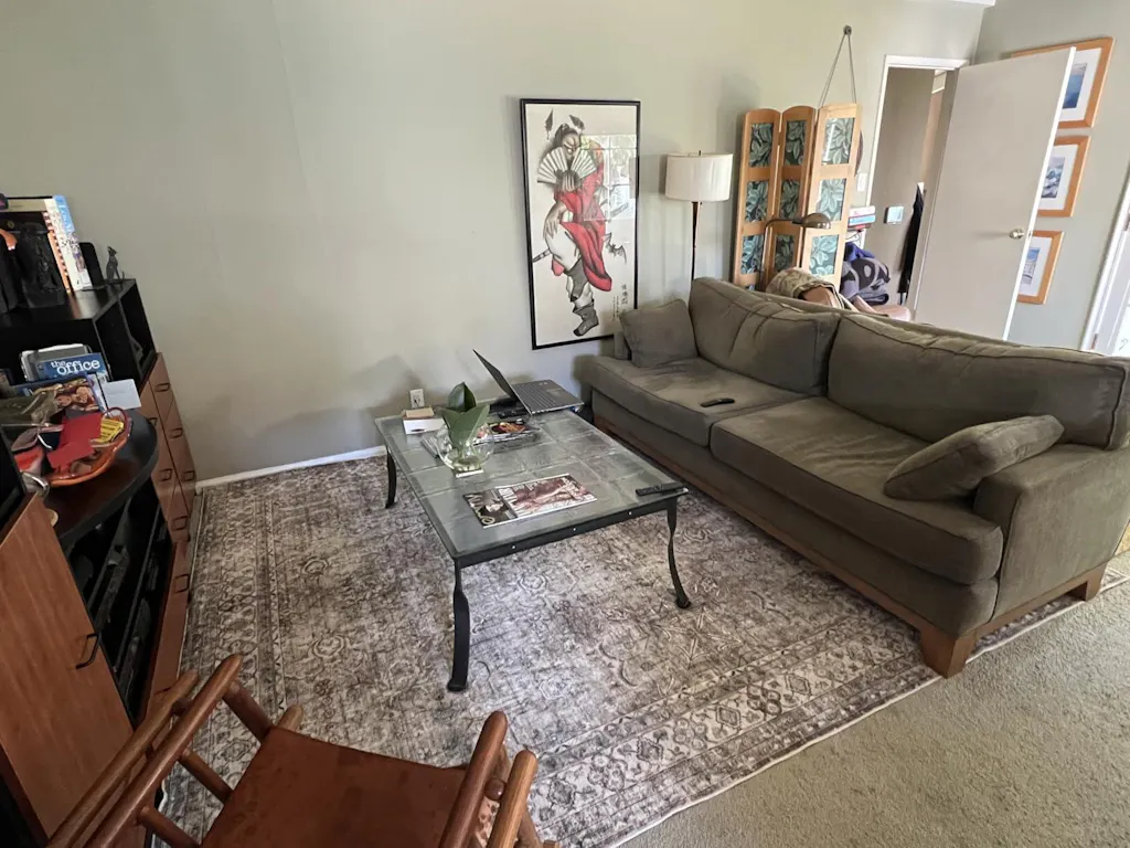 I bought a house in 1997 that was built in 1946 and was a tiny two-bedroom house, and which before I bought, had a large bedroom suite put where nothing previously stood; this turned what was probably a dining and living room into a strange box-shaped room that I had to figure out when I moved in, since there is a door at its back leading to the primary bedroom suite. What we decided to do was turn it into a living room in the literal sense that when we’re not asleep or in our office spaces (previously two bedrooms), this is where we spend most of our time. We dine at a café table in our kitchen and a have a large “main room” which is where we keep a fancy dining table which, not being fancy types, we never actually dine in. So the room that we variously read in, watch a lot of TV in and hang out in to chat and nap in became the fulcrum of the house and needed focus. We’ve had a series of good-sized and nice-looking carpet in the space but we recently got this huge (80 square foot) carpet which has solved a lot of problems, dividing the room into two distinct spaces, breaking up the box like nature of the space and most importantly, adding a nice distinction to the space. We’ve got a lot of washable carpets in the house which are a recent and very satisfying innovation. This is very cozy piece which vacuums easily and while theoretically, machine washable, is far too large for our machine; this size will require taking to a professional service with large washing machines. But it vacuums easily has a plush you-can-walk-barefoot-on-it feel, and should last a long time. At this price point, it wouldn’t break the bank to replace it, but this ought to be good for many, many years and has really given a nice feel to our primary living space, whatever it’s called now.