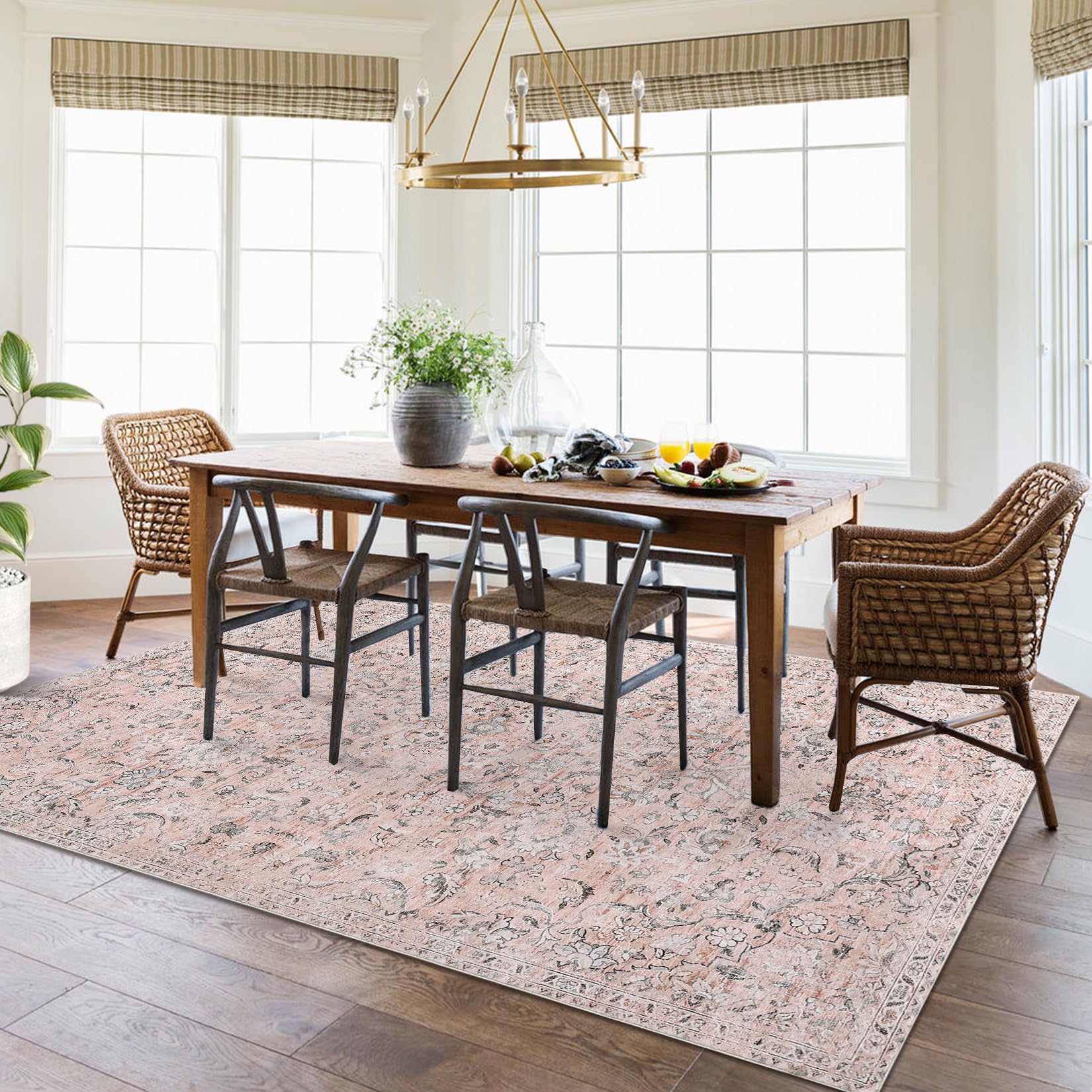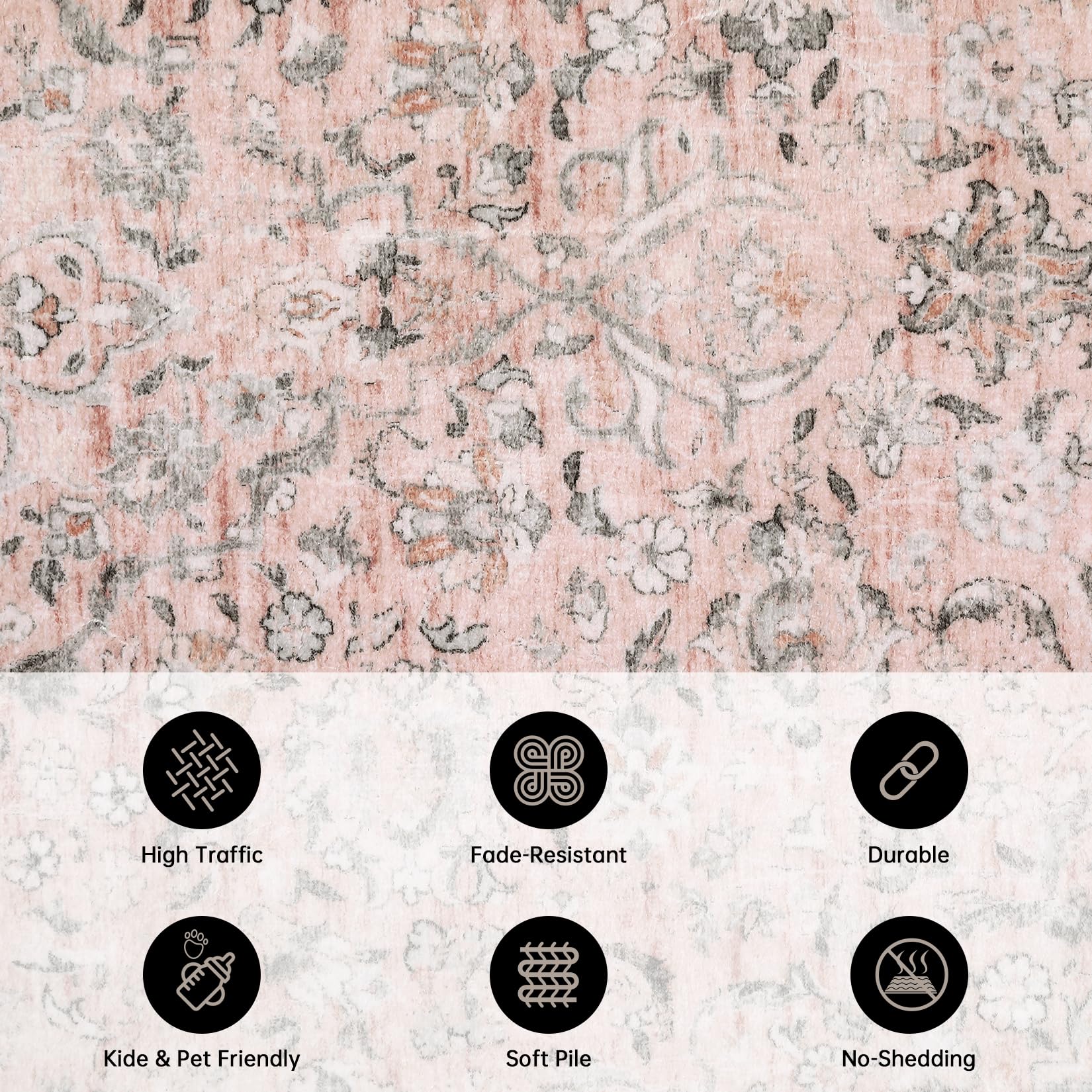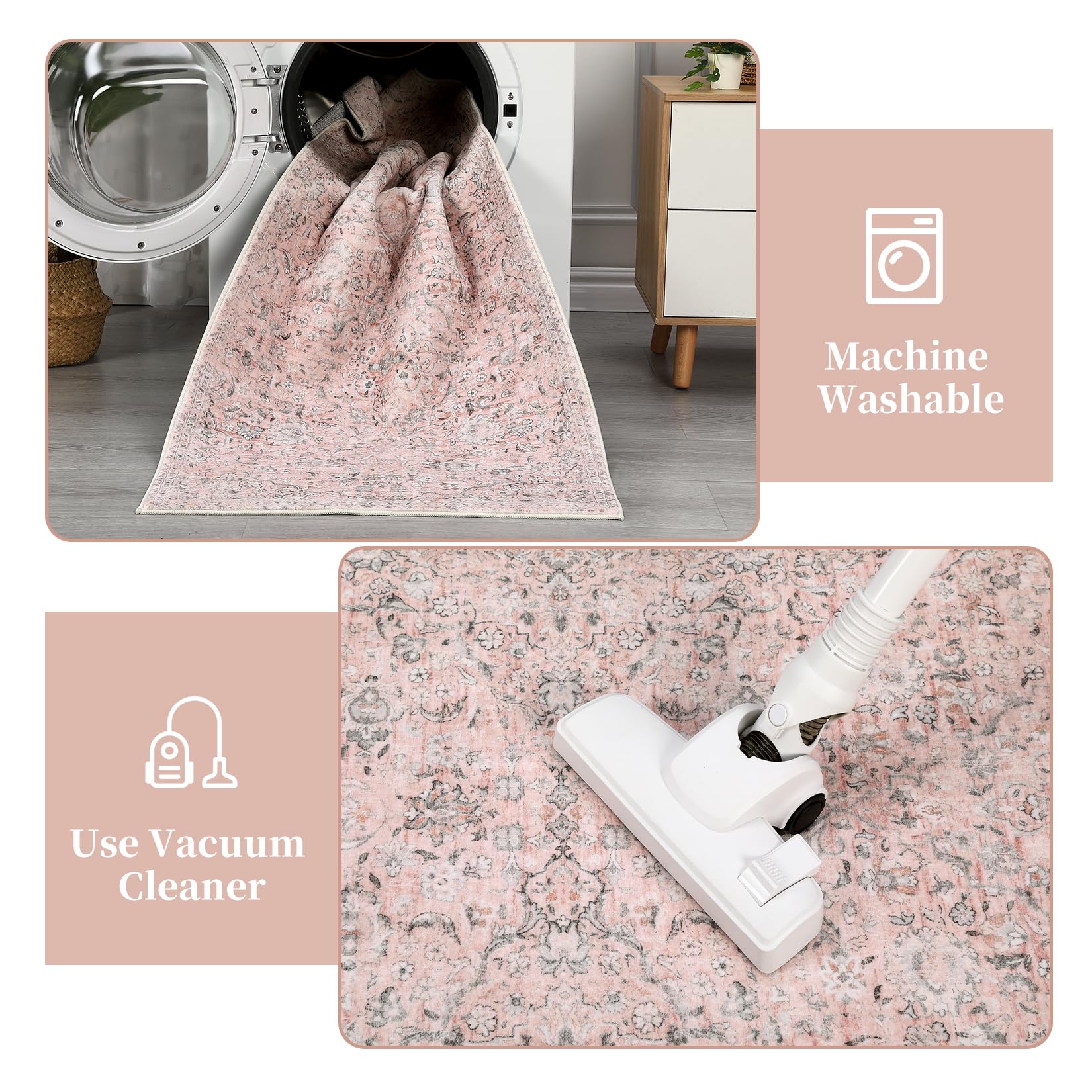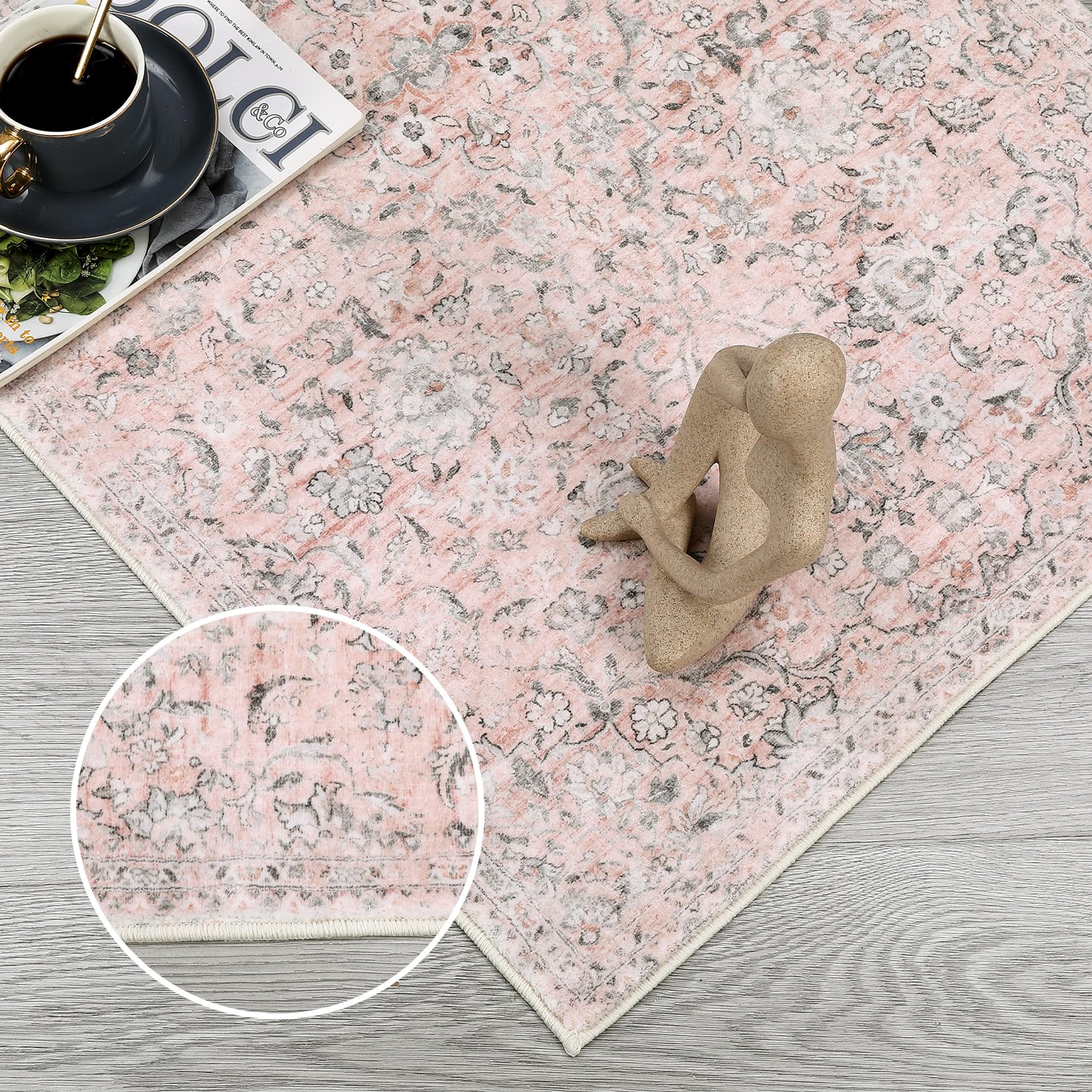 Garvee Washable Area Rug 5x7 Rug for Living Room Vintage Floral Area Rug for Bedroom Retro Non Slip Throw Rugs Soft Low Pile Stain Resistant Carpet for Dining Room Nursery Rug 5'x7' Pink