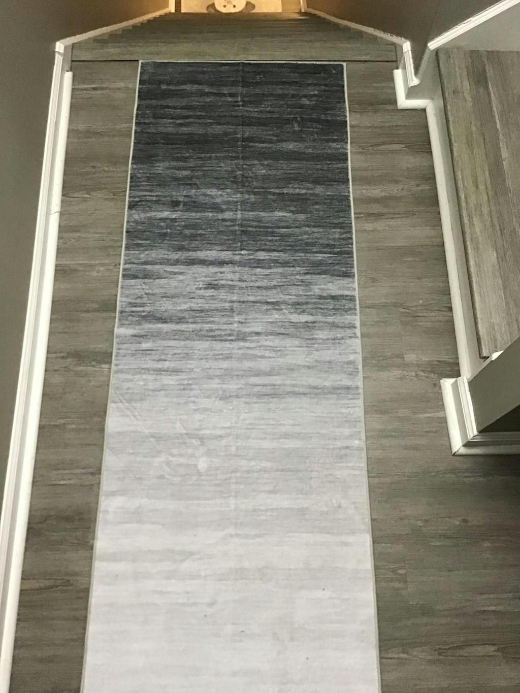 This runner rug is ultra soft and cushy with a non-slip grip backing. Thicker than I was expecting, but I think it will be easy to wash. I put it in my dryers steam cycle to try to remove the lines from being folded, but couldn’t get the big one out. There were also bits of fibers or lint rolled on the surface I had to brush off.The ombré design is sleek and will look nice with almost any decor. Not the fanciest rug and I’m not sure about heavy traffic, but I’m happy with it. Just wish I could get those wrinkles out.
