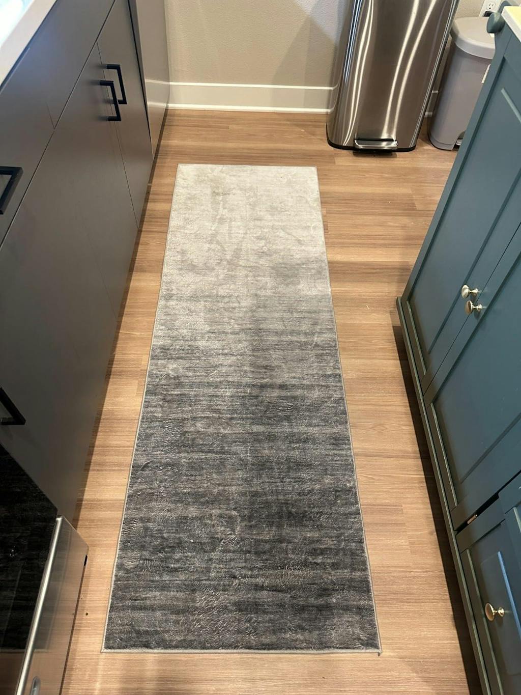 I love this rug! It has added a nice flow from my green island to my gray cabinets. The rug has held up to abuse for over 2 months and looks great. It easily cleans up in the washer, and it being a low pile makes vacuuming easy. Even my robot vacuum has no problem getting over the rug. I would highly recommend, this rug is a great value.