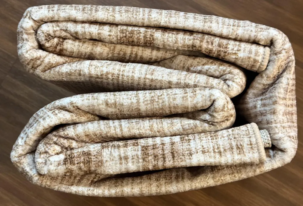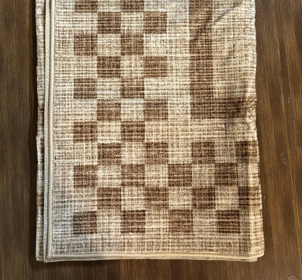 I’m so in love with the pattern of this rug. With the little checks that go around the edge of the rug in a nice broad edge I just love it! The color is really pretty too. It’s listed as a taupe, and it is. it’s got a rustic quality. That looks really nice in my room. The rug feels well-made. It doesn’t have a lot of pile but it’s still soft. The non-skid back, keeps it in place on the floor and the edges are stitched tightly. There was no shedding. There was no smell and I’m excited that I can someday put it in the washing machine. Very happy.