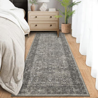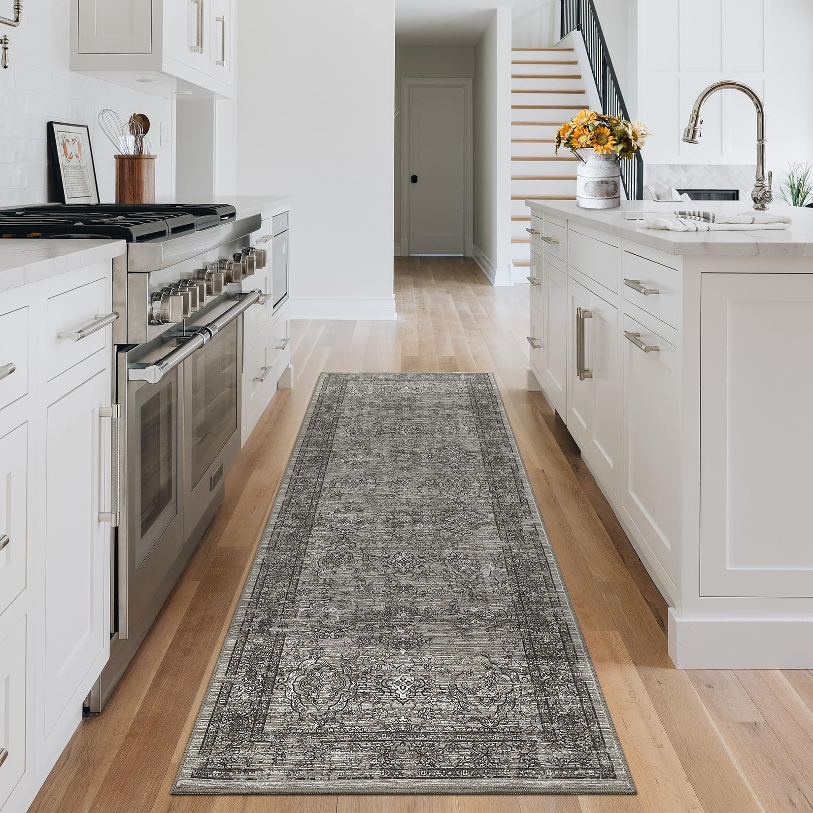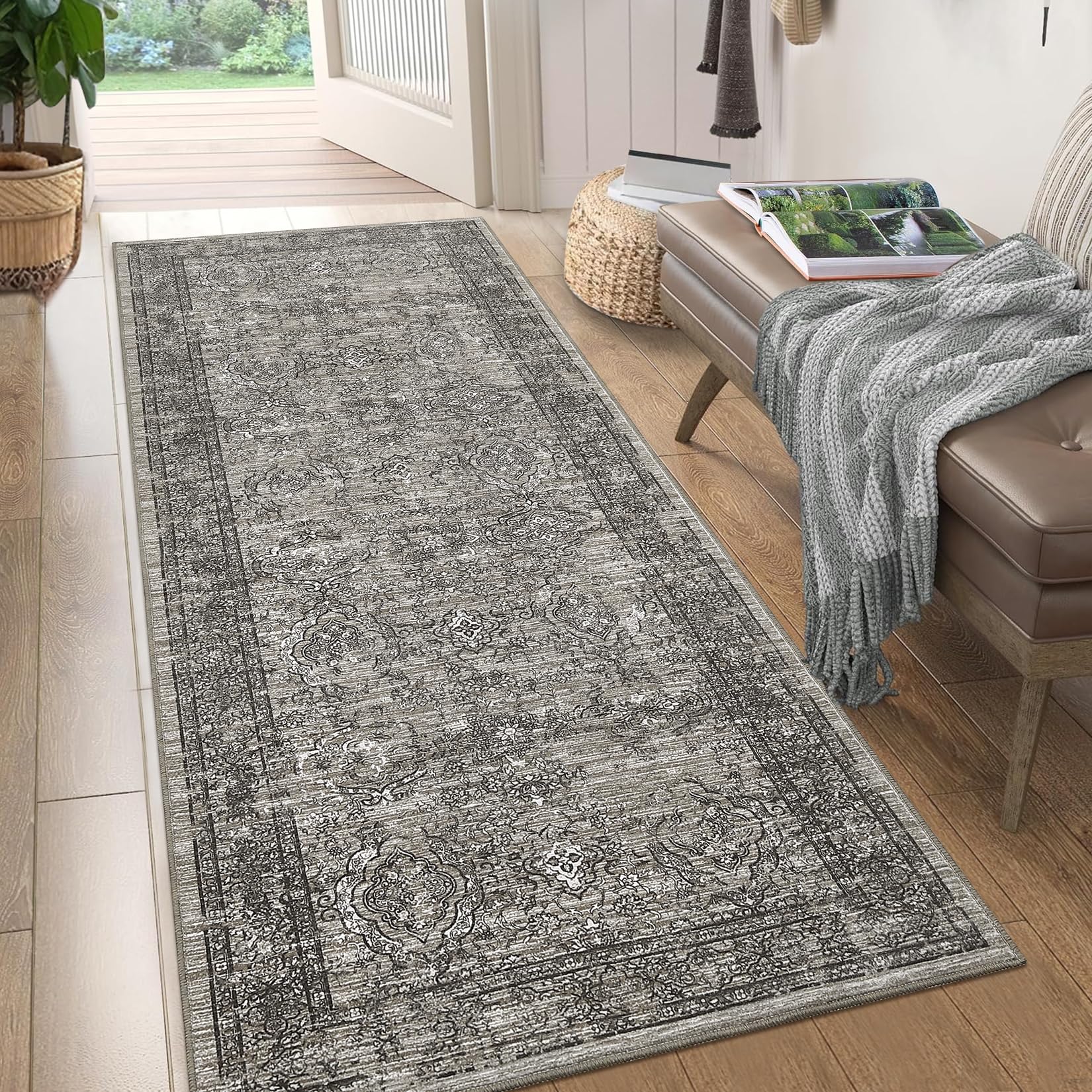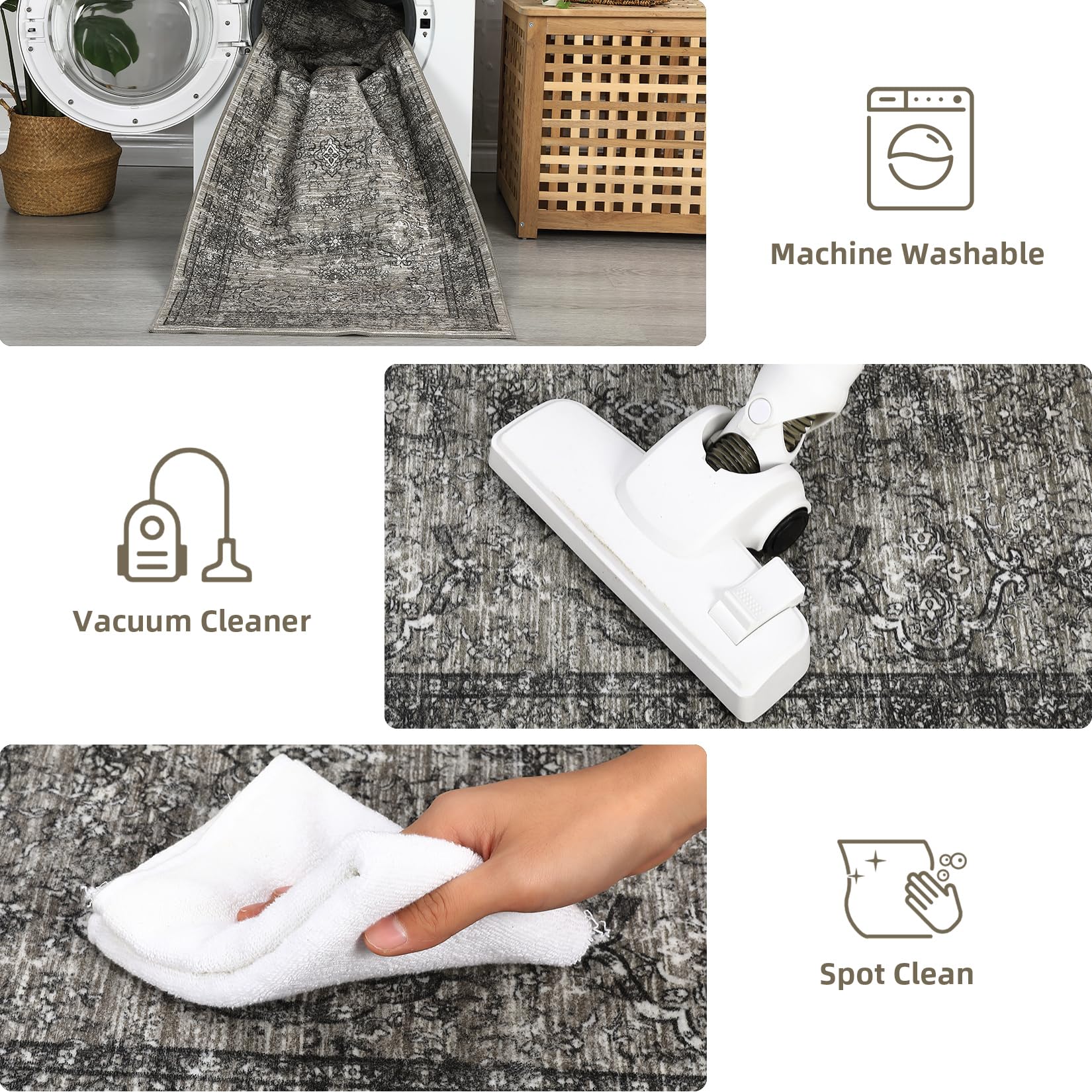Garvee Washable Runner Rug 2x6 Runner Vintage Rug Non Slip Kitchen Rugs Floral Distressed Indoor Entryway Rug Soft Bath Mat Stain Resistant Carpet for Hallway Laundry Bedroom 2'x6' Greyish Brown