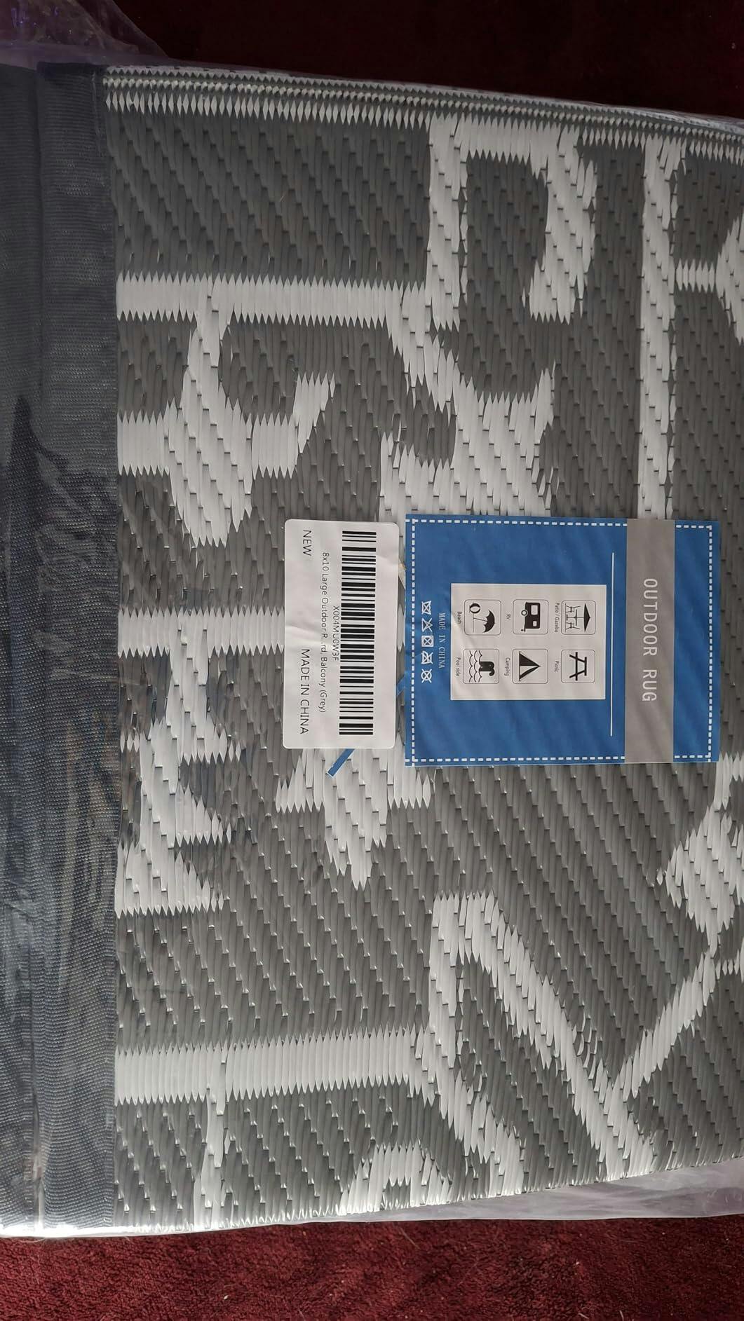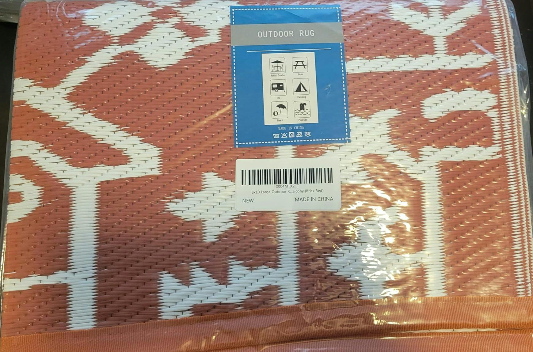 GARVEE Large Outdoor Rug, Waterproof, Reversible, Plastic Straw, Foldable Lightweight COLOR Vintage Terracotta Brick White, SIZE 8' x 10' Rectangular: This outdoor rug arrives folded with four small metal stakes and a carry bag. The color is accurately depicted in the listing. The folds in the rug will take time to decrease, but it doesn't bother me because it makes it easy to re-fold. There are four corner loops for the stakes. This is very easy to clean too, just hose it down. The carry bag is black but clear on the top, making this easy to store or transport. Very pleased.