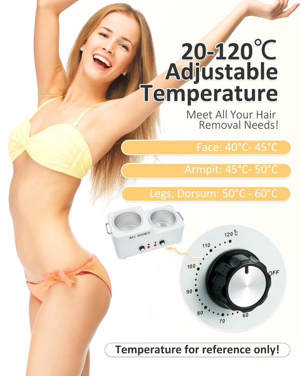Independent temperature settings 0-80°C (32-176°F) for each pot, perfect for different wax types and treatments.