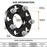 | 5x120 Wheel Spacers Specification | 2pcs 15mm Thickness, 5x120mm Vehicle Bolt Pattern,5x120mm Wheel Bolt Pattern, 72.56mm Center Bore with lip, M12x1.5 Threaded Studs/Nuts. |
