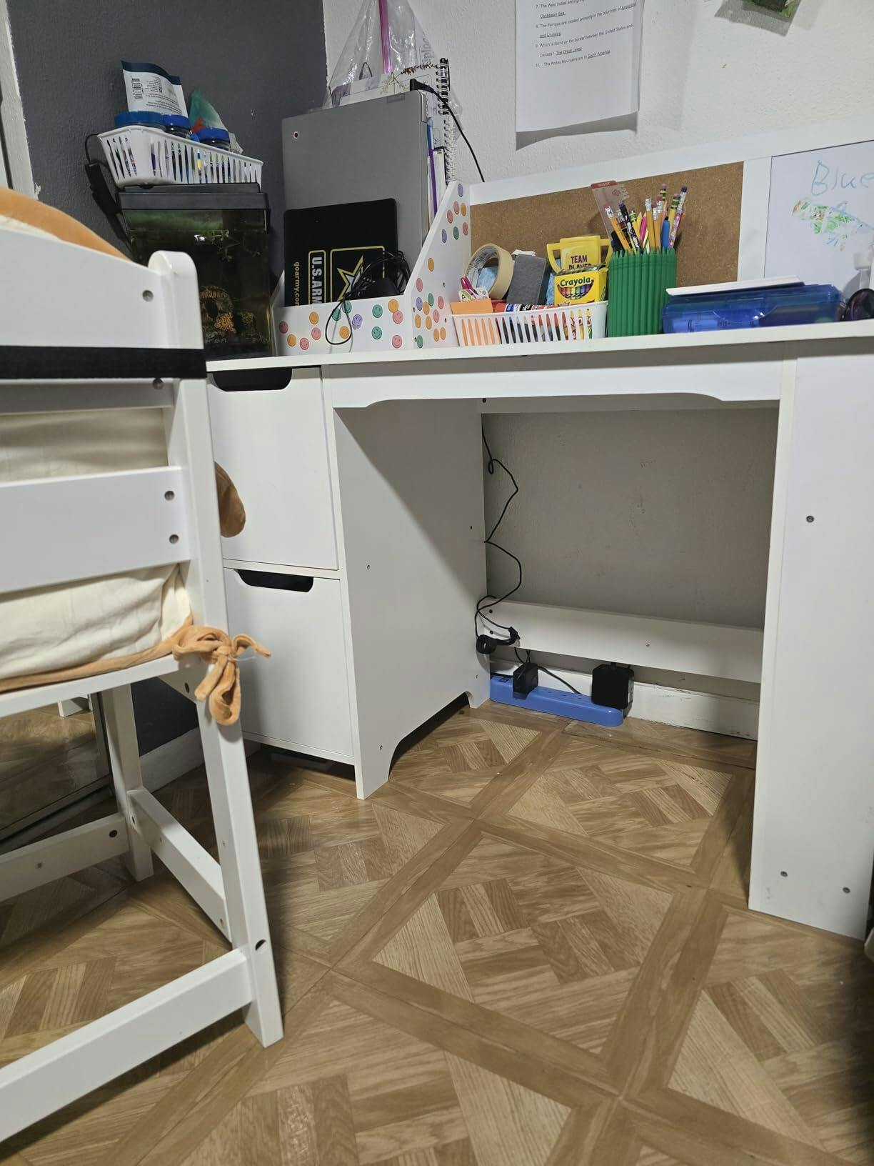 - Large Storage Capacity: The desk set features ample storage options, including opened storage, a bookshelf, cabinets, and a cork board. Personal items like photo frames, alarm clocks, mini plants, dolls, and books can all be organized and stored neatly.