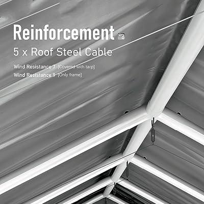 - [Sturdy Frame] Reinforced with bottom steeled bars and roof steel cable to lock up the whole frame together to ensure maximum stability. Recommend adding extra sandbags(Not included) to withstand the storm.