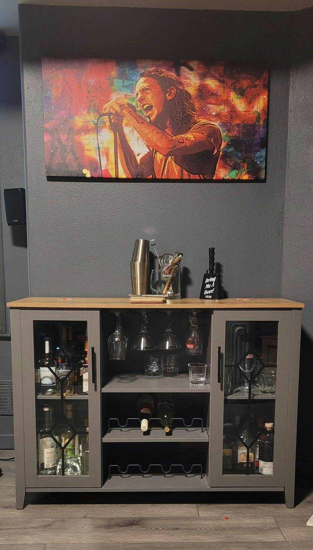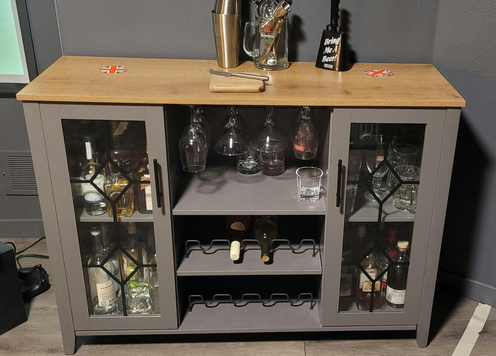 The bar cabinet is made of durable, high-quality particle board that is waterproof and capable of withstanding long-term use.