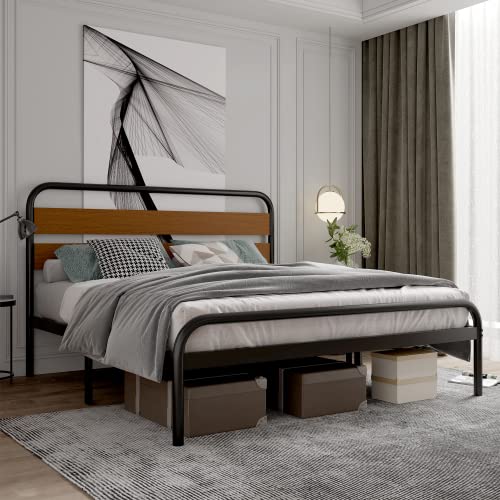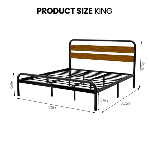 Garvee King Size Platform Bed Frame with Wood Headboard, Heavy Duty Metal Slat Support, Noise-Free Design, Easy Installation, Light Brown, 12.6" Underbed Storage, Industrial Style