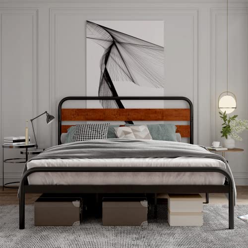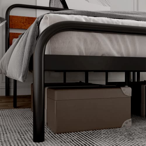 Garvee Queen Platform Bed Frame + Wood Headboard + Heavy Duty Metal Slat Support + Noise Free + Easy Installation + Dark Brown