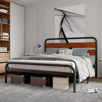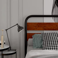 - Rustic wood grain headboard with sturdy metal frame
