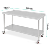 Garvee 60"L x 24"W x 35"H Stainless Steel Work Table with Wheel and Backsplash, Heavy Duty Metal Table Cart Worktable, Commercial Workstation for Restaurant, Home and Hotel