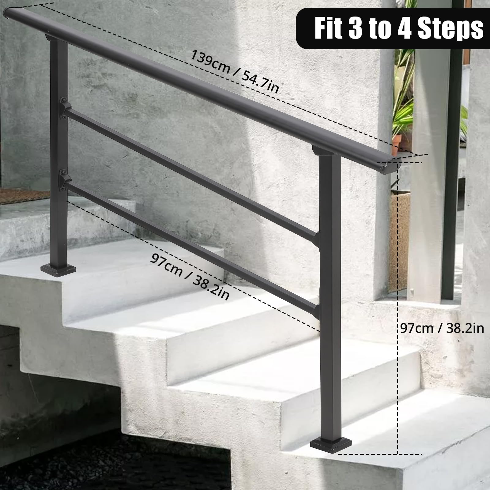 Garvee Handrails for Outdoor Steps, Outdoor Stair Railing Fits 3 to 4 Steps, Sturdy Porch Railing with Installation Kit, Black Wrought Iron Hand Railings for Outdoor Steps