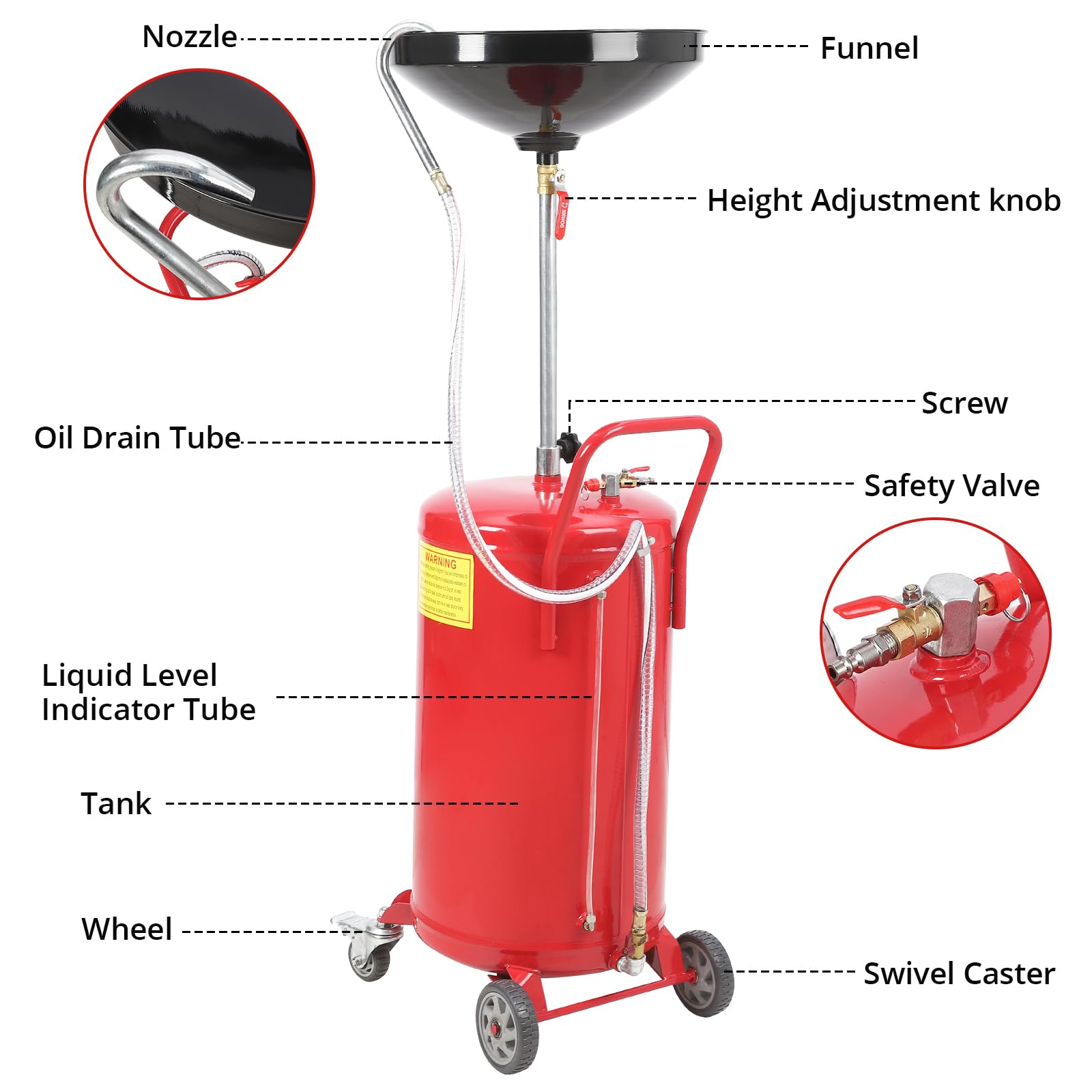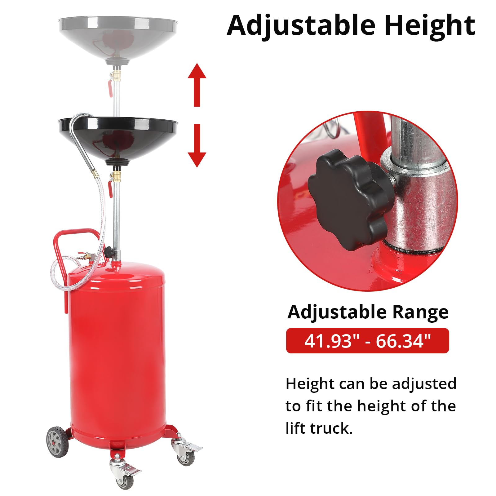 - ADJUSTABLE HEIGHT The 20 gallon drain hose has a variety of adjustable heights from 41.93 to 66.34 inches for draining fluids from vehicles on lifts. Capable of properly accomplishing the collection of automotive waste oil. Ideal for perfectly accomplished collection of automotive waste oil in factories, auto repair shops and homes.