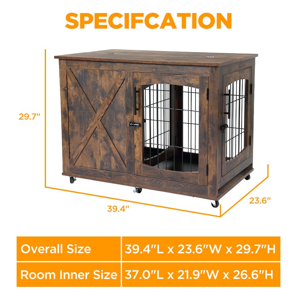 Garvee Furniture Dog Crate End Table, 39" Wooden Dog Kennels with 4 Doors,Sliding Barn Door with Divider, Dog House Indoor with Wheels