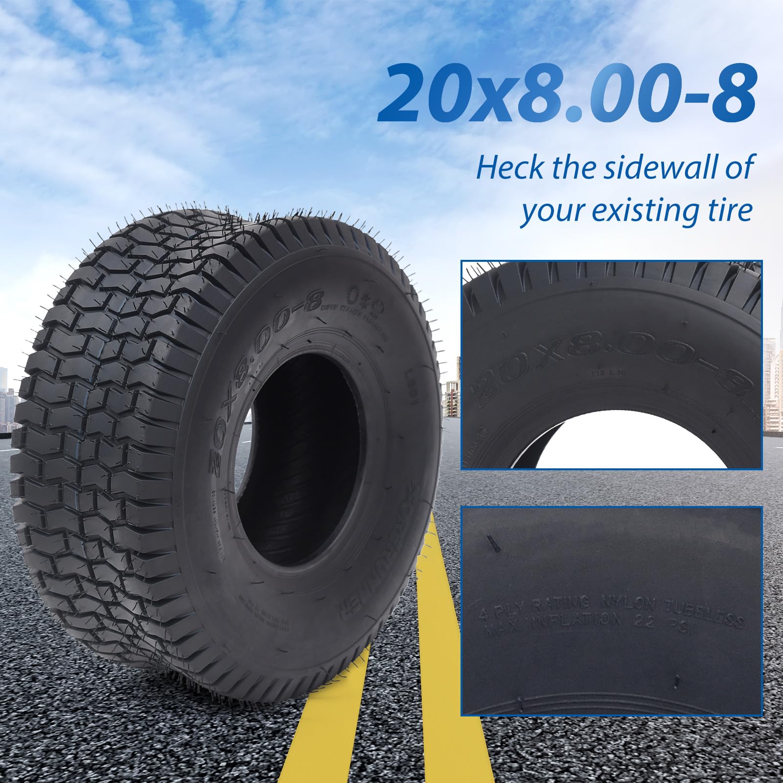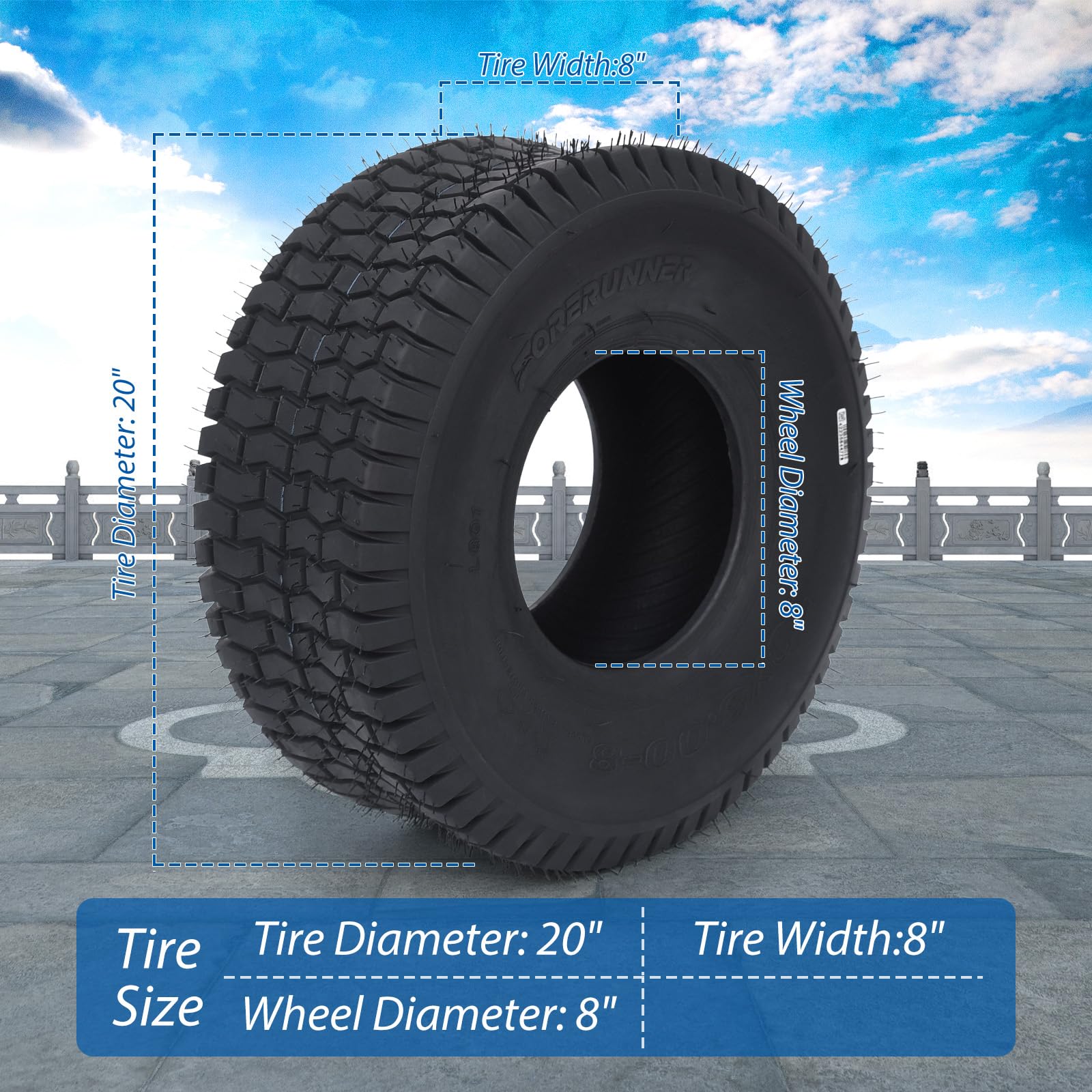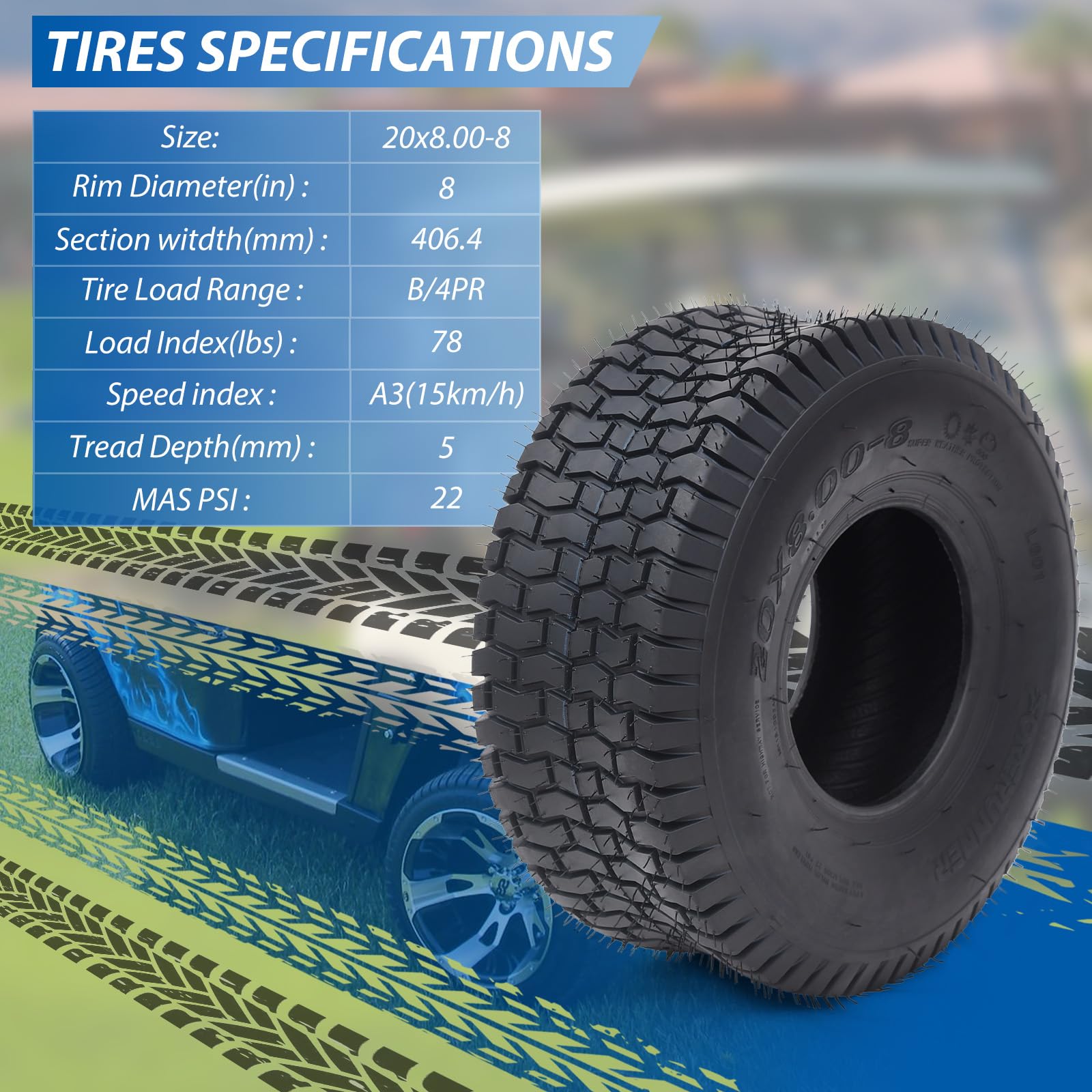 - Tire Specifications/ TireSize: 20x8.00-8/ Tread Depth: 5MM/ Brand: GARVEE/ Ply Rated: 4/ Aspect Ratio: 0.71/ OD: 493MM/ SW: 203MM/ Max Load: 950/ Load Speed Index: 78 A3