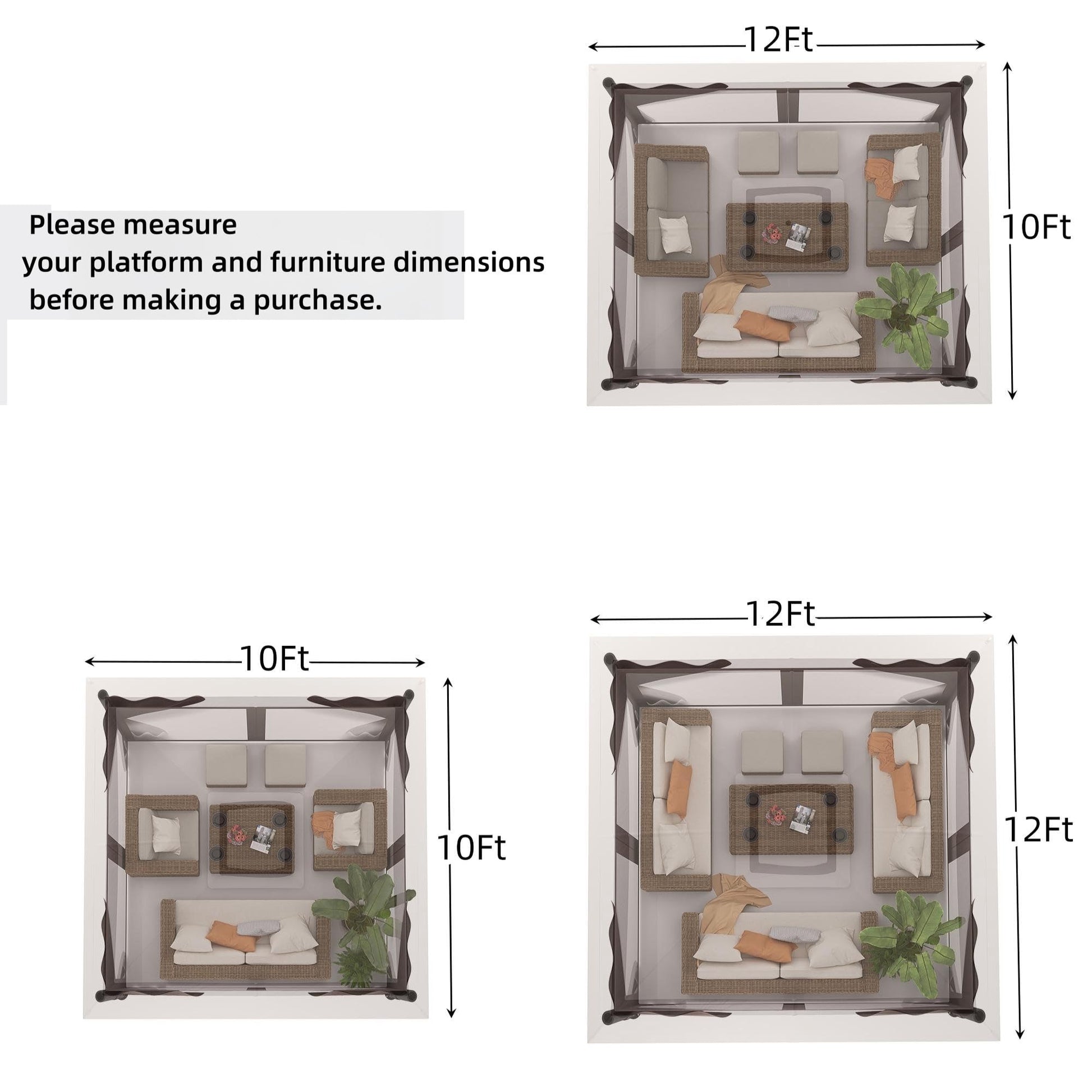 - [ Spacious Space ]: This outdoor gazebo offers 144 square feet of space, accommodating 10-12 people for entertainment; And our gazebos is 12'L x 12'W x 10.8'H, please measure your platform and furniture dimensions before making a purchase.