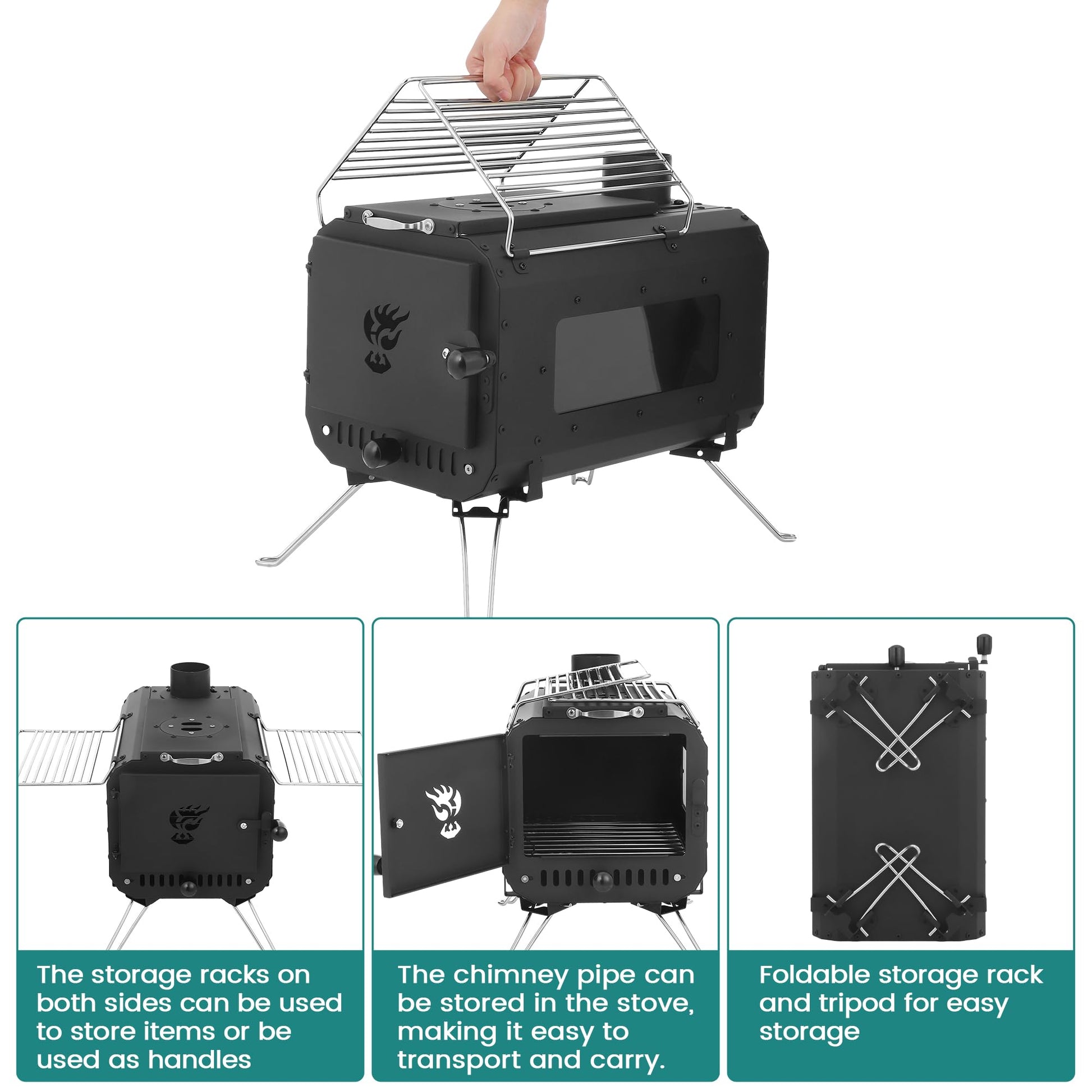 Our tent stove is designed with handles on both sides. The shelves on both sides can not only store cooking ingredients, but can also be used as handles to facilitate the movement of the tent stove.