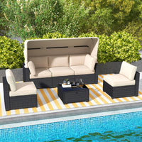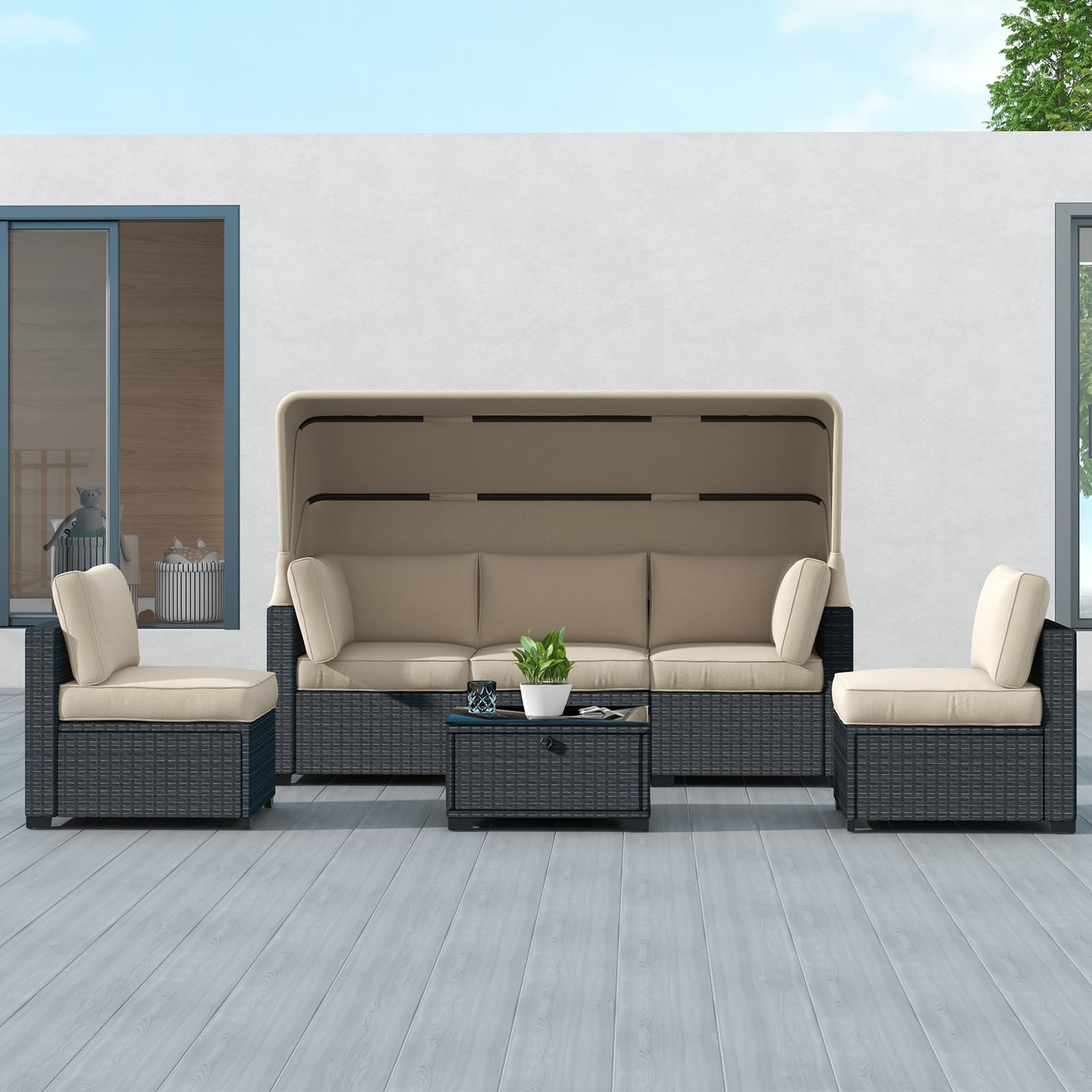 Garvee Patio Furniture Set, 6 Pieces Outdoor Wicker Furniture with Canopy, Outdoor Sectional Sofa and Table with Storage, Patio Conversation Sets for Balcony, Porch, Garden, Backyard, Soft Beige Cushion