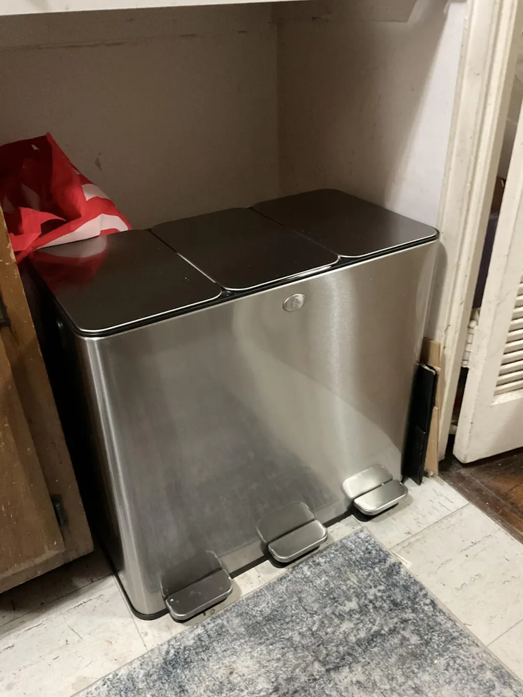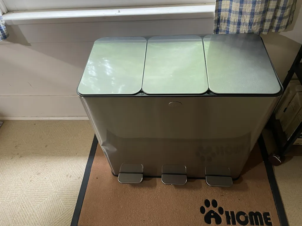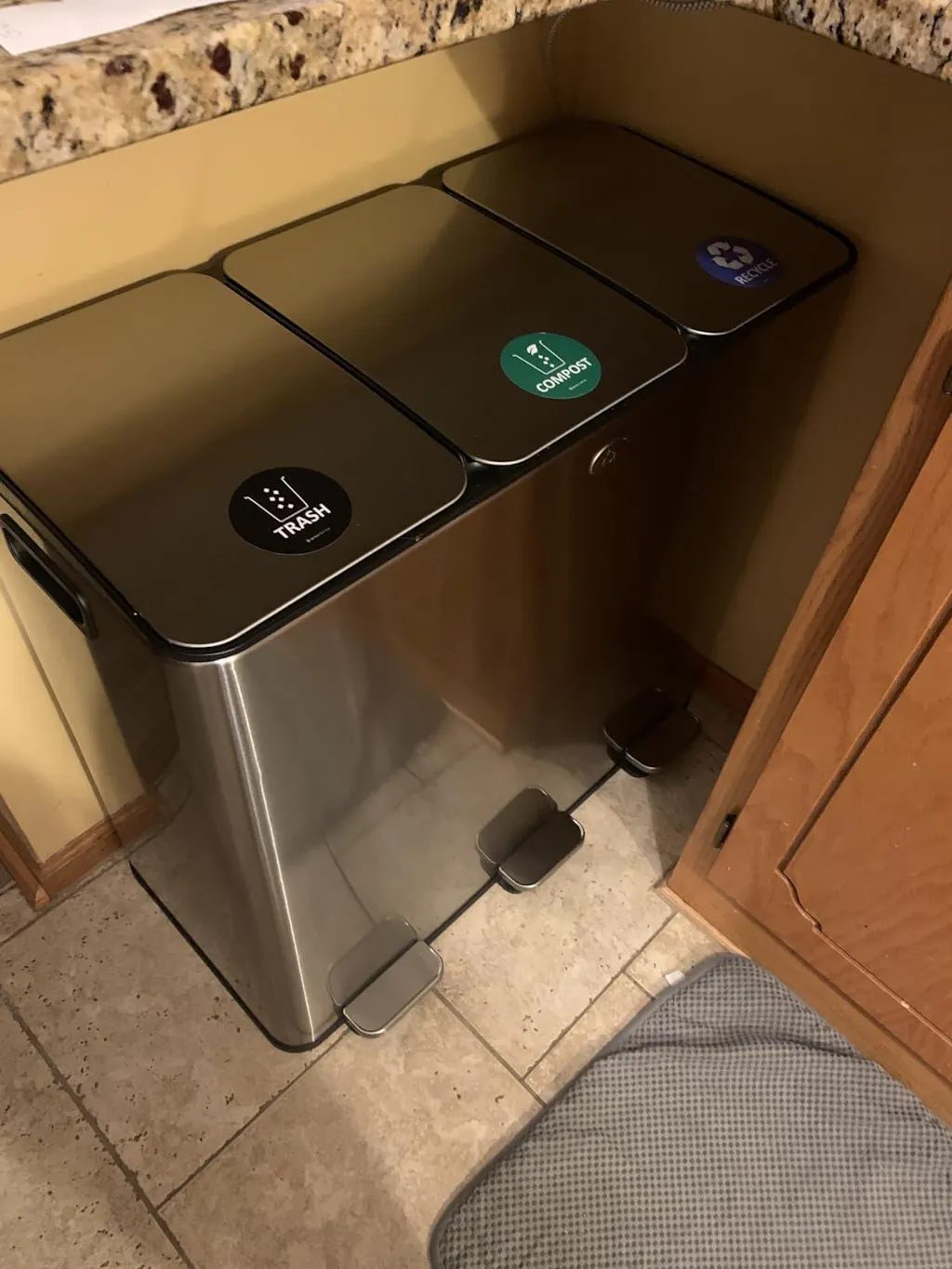 This is a side-by-side unit with three garbage cans, each featuring three foot pedals, three slow-closing lids, and three color-coded bins. Now that our city mandates composting, these bins will be a lifesaver! The best part is that the bins are interchangeable, so you can arrange them in any order that works best for you.However, the bins are smaller than our previous trash cans, so you might need more bags of garbage if you wait until they’re full.Also, the can is shorter, which means you won’t hear the lid banging on the shelf above it.They include a compartment for charcoal pads to help eliminate odors. The pad supplied is a the size of a small guaze bandage and I'm not sure how effective they will be.There are handles on both sides of the can, so you can easily move it. It’s quite wide, which is to be expected with three trash cans. The operation is very quiet.We ordered this prerelease, and at the original price of nearly $180, it was quite expensive. Three months later, they lowered the MSRP to $140, and Garvee has it on a limited sale for $116, which I think is a reasonable price if you’re committed to being an eco-warrior.Just a heads-up that you’ll also need compostable trash bags, regular trash bags, and carbon filters in addition to the trash can.