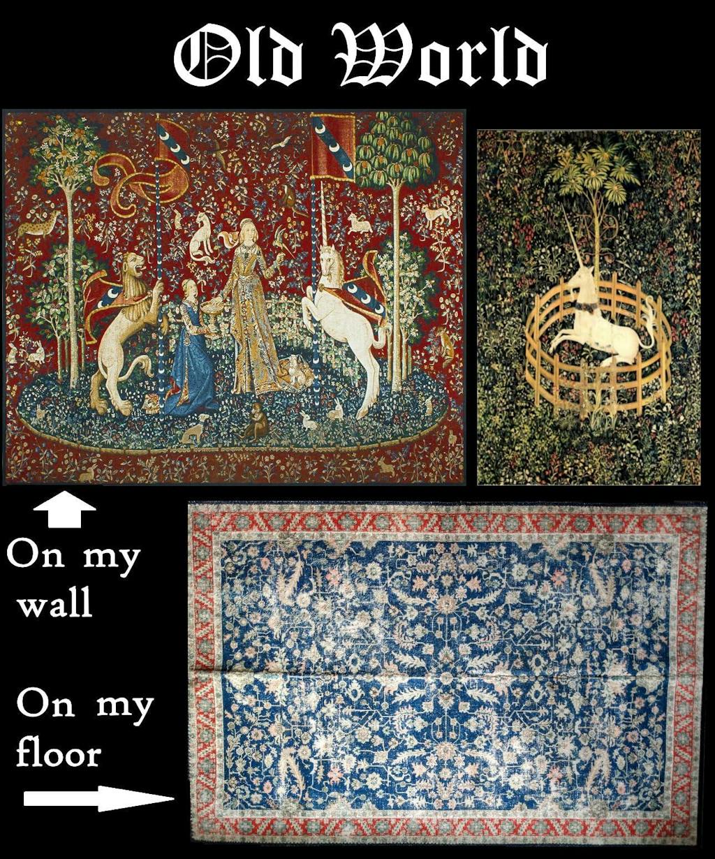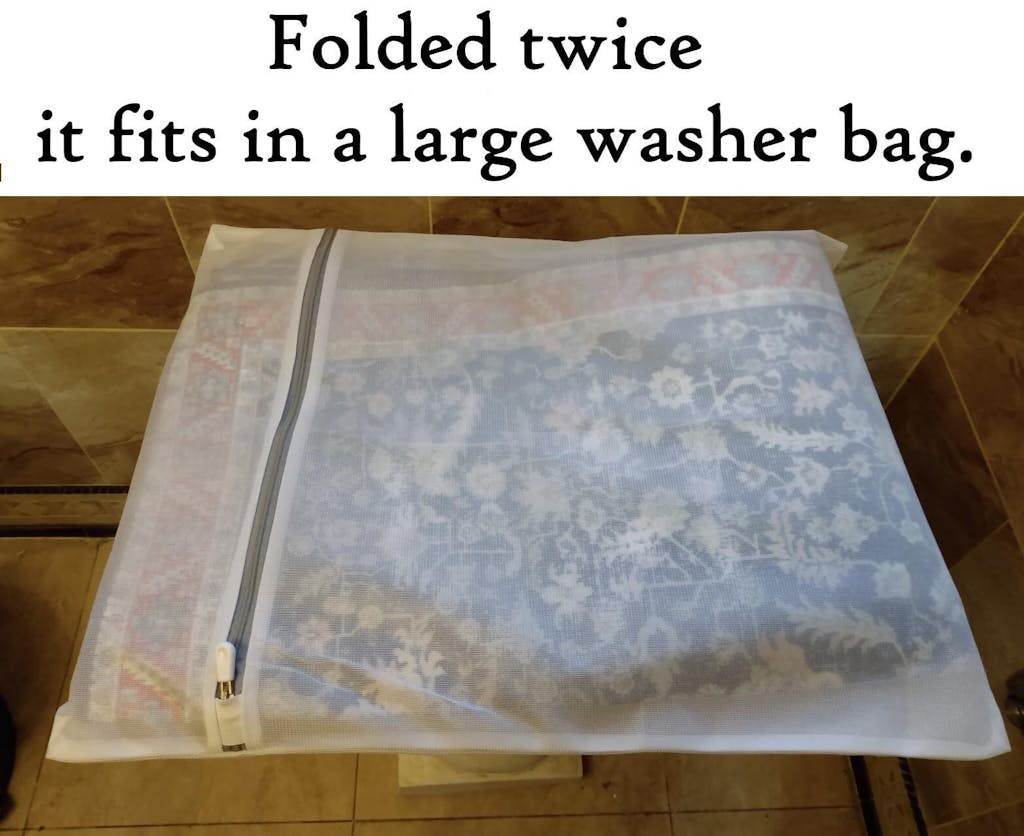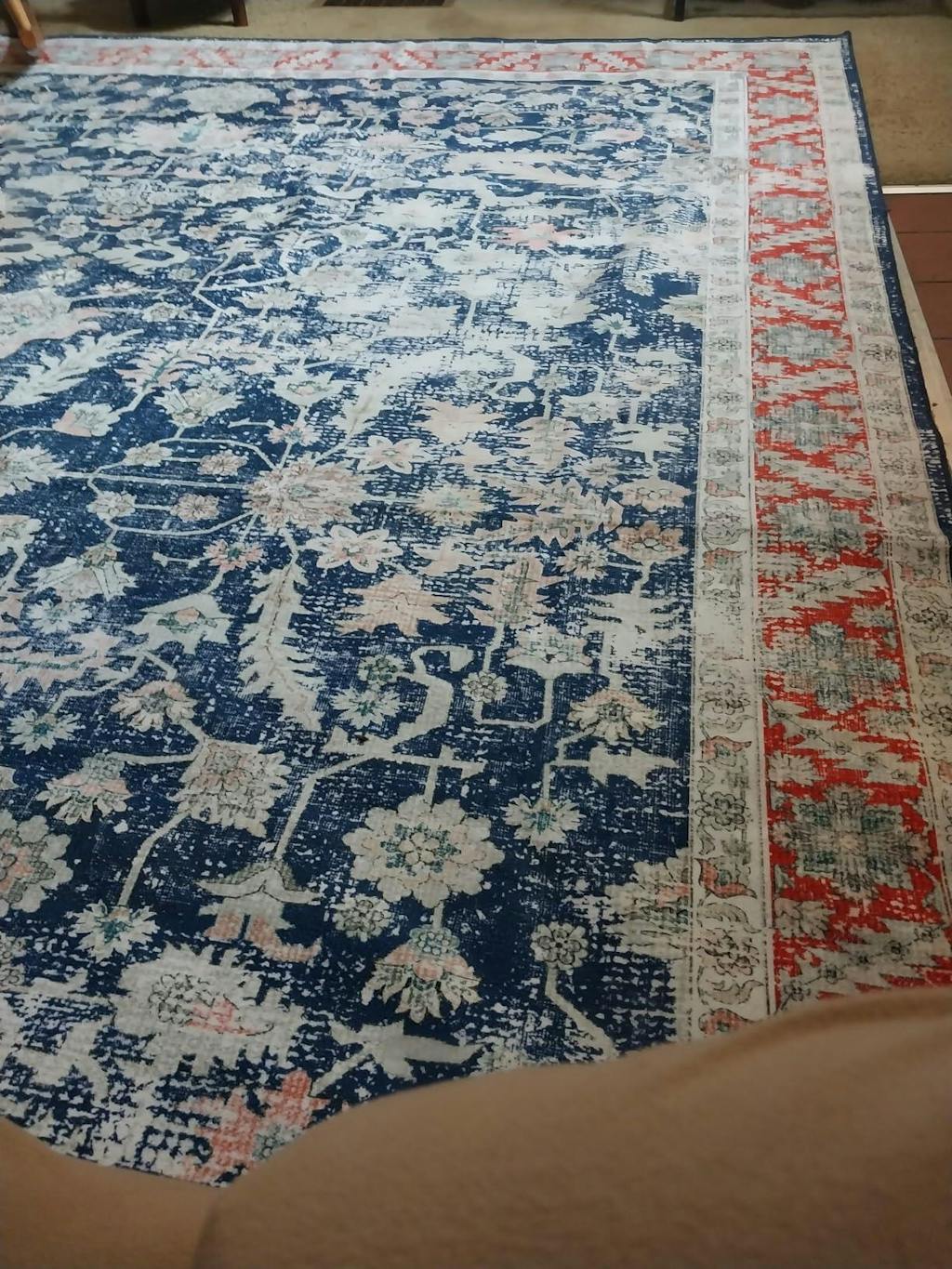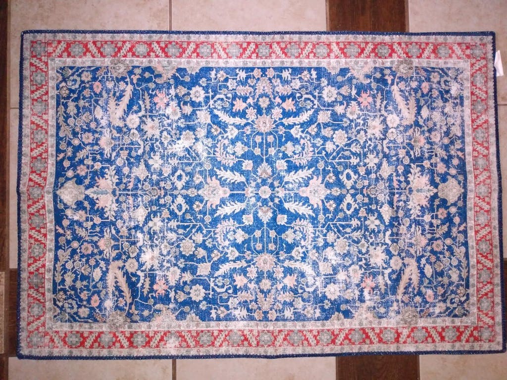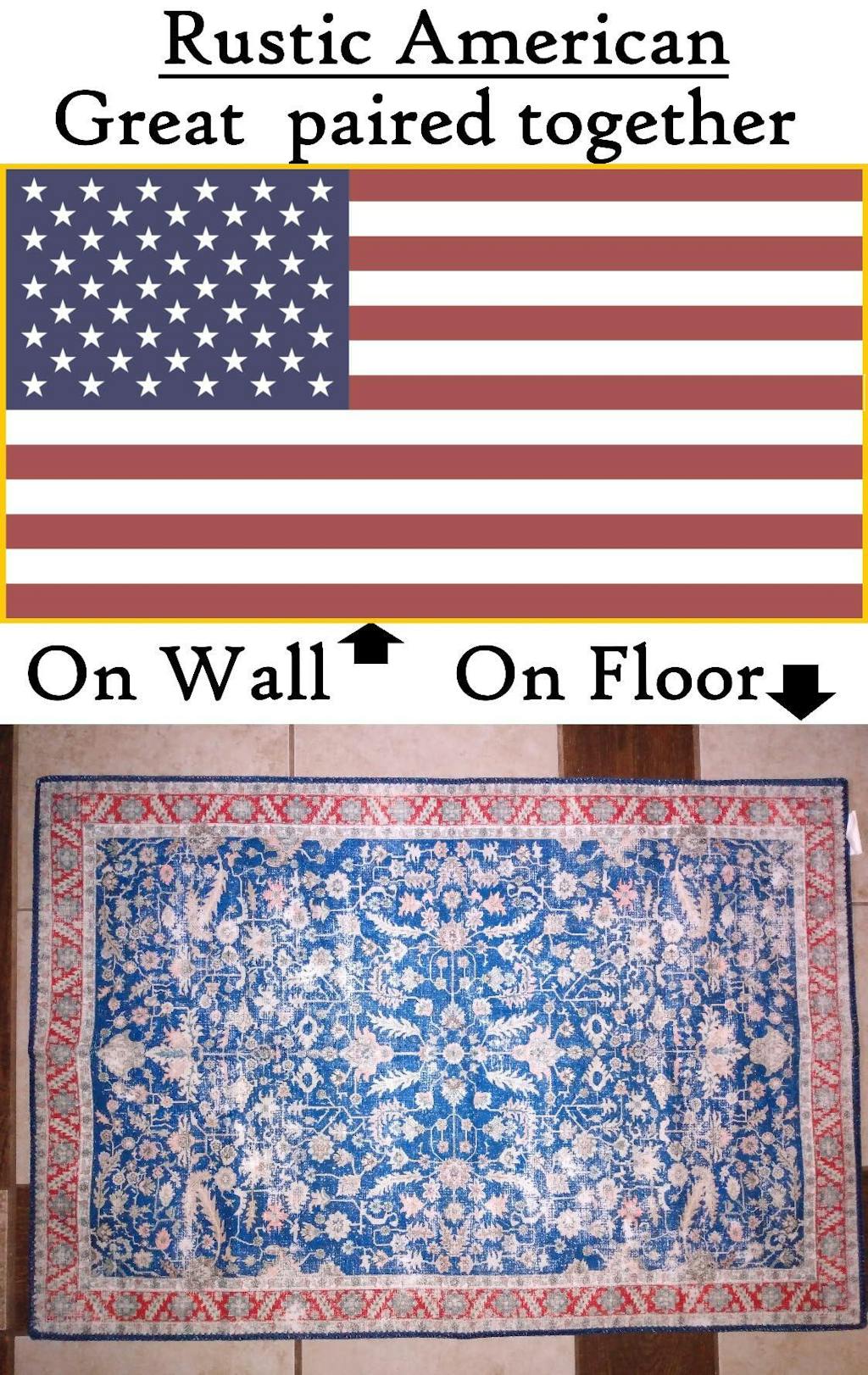 When I saw the design and colors of this rug, I immediately liked it. It coordinates well with two reproduction medieval tapestries I bought. (https://www.garvee.ca/Fine-Art-Tapestries-Unicorn-Tapestry/dp/B00A2YTMZ8 ) Their main colors were the same red and blue, and their style of drawing plants was very primitive, just like this rug. They would go great together. I went back to order the rug, and it was sold out already! I was heart-broken. I waited, hoping it would come back. It did! I grabbed it immediately before it could get sold out again. I'm so HAPPY with it. (See in the photo, how well it goes with the tapestry.) The rug is exactly like the photo on Garvee. It would also go great in an a country style room decorated with the American flag. It would also go great in any room that has navy fabric in it, like a navy couch or bedspread. Navy and red are mainstream colors that go with lots of decors. I put this in my bedroom, in front of the sliding patio door. My dogs go in and out of this door all night long. I needed a washable rug here to catch the dirt and rain water off their feet. One of my dogs likes to sleep in front of this door Now my dog can sleep on this nice rug instead of sleeping on the bare tile floor. The dog hair does not stick to it. That is exactly what I needed! I can sweep it with a rubber broom, or vacuum it; all the hair and dirt comes right off, fast and easy. It is a smooth flat polyester fiber. The pile is less than an 1/8” tall. That is deliberate, to make this a utility rug that can be easily cleaned and won't absorb dirt. How many UTILITY rugs have you seen that are this beautiful, and washable too?! This is the first one I've seen. It is the type of rug you can put in the kitchen, bathroom, and inside the doorway. But it's beautiful enough to use in playrooms, family rooms, offices and more. I machine wash it, along with dog blankets. I folded the rug twice, with the pile on the outside. This fit perfectly into a large 19”x15” washer bag. The bag prevents the rubbery backing from getting too stressed. It washes fine. The manufacturer does not recommend heat drying it in the dryer. That would degrade the rubbery backing. He says use “air-dry” only. So I put this rug in a sneaker dryer bag, (https://www.garvee.com/dp/B0CCR1YRSF?th=1 ). Again, I folded the pile side out, to protect the rubbery side. These bags work great on rubberized fabric. But that's a different review. The bag hangs on the inside of the dryer door, so there's no tumbling stressing the rubbery backing. I tried “air-dry”. That didn't work for me. I live in the northeastern US. Climate change is sending all the rain to us. It's always damp here. Nothing air-drys anymore! I hoped that if I kept using the drier bag, I could do “low-heat”. I tried that. It didn't work either. Frustrated, I threw caution to the wind. Keeping it in the drier bag on the door, I used “medium” heat. That worked. I took it out of the drier bag. The hanging bag protected the backing from physical stress. Folding the backing on the inside, also protected the non-slip surface from extreme heat and over-drying. The inside was still a little damp. I hung it over the shower stall to finish air-drying. By morning, I was able to put it back on the floor. If you live in a drier area, then air-dry may work fine for you. The rug photos were taken AFTER it was washed and dried. You can see how well it stood up. 5 STARS!