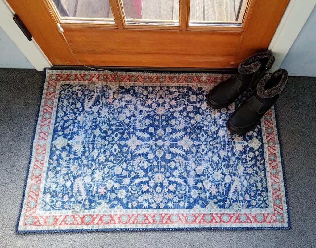 I like the design and it is very thin which I like because the door moves right over it. The previous rug I had there would always move when the door opened or get stuck when I closed it. I also like the thinness because I don't trip over it or accidentally kick it around. If you are looking for a cushion-y rug, you might need to add a pad under this. This is thinner and not as soft or plush as other similar style rugs. But it will be good for by the door because it is easy to wash.