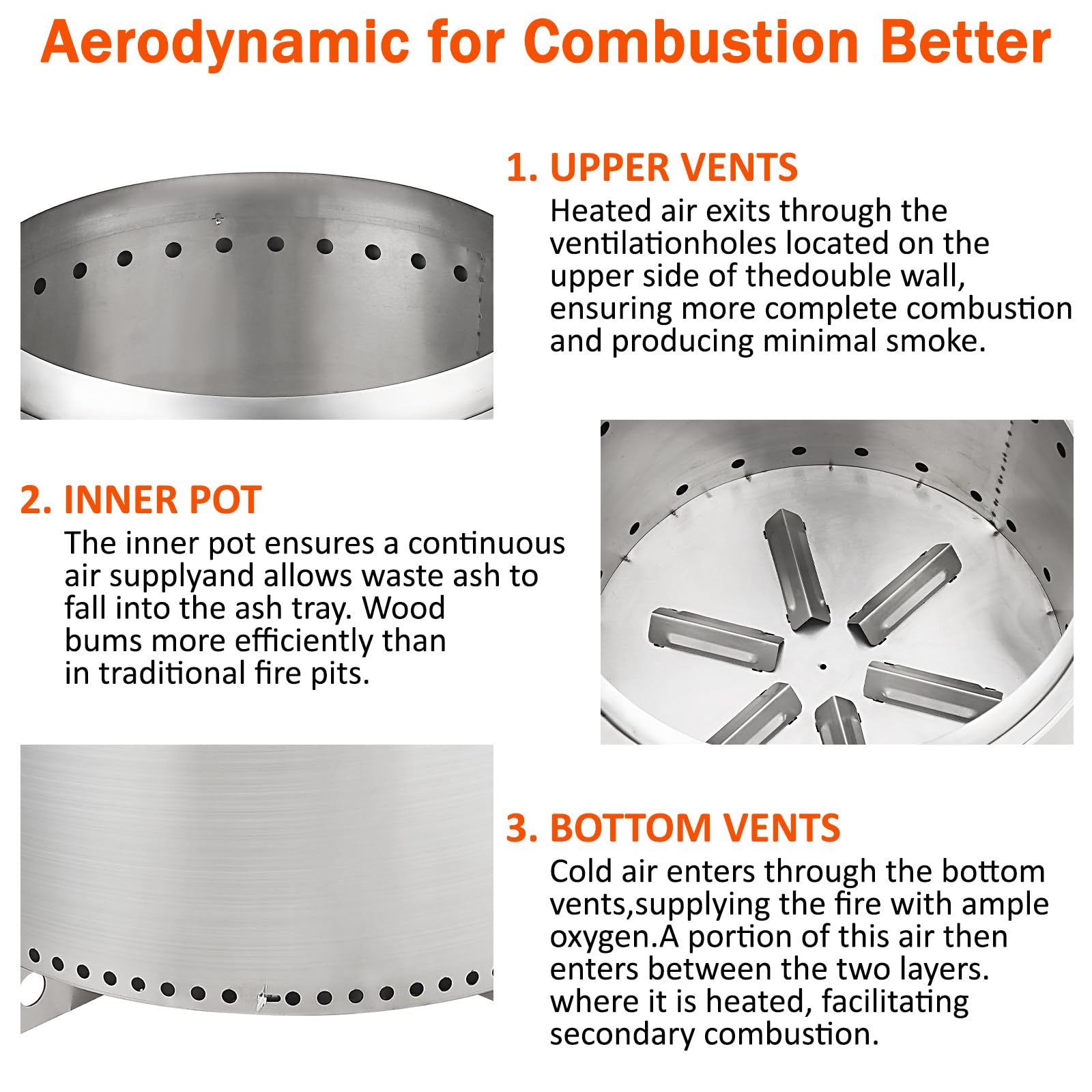 Round hole design at the bottom is aerodynamic, the fuel burns more fully and produces less smoke