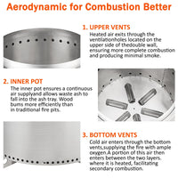 Larger round vents at the bottom increase the amount of oxygen by 150%, allowing the flame to burn more fully, further reducing smoke.